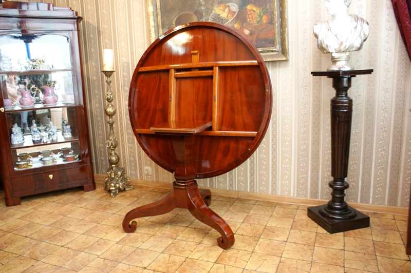 форма цього предмета меблів надзвичайно красива і типова бідермаєр. Велика кругла стільниця спирається на шестикутну ніжку зі штативом, а кожна ніжка закінчується красивою равликом!