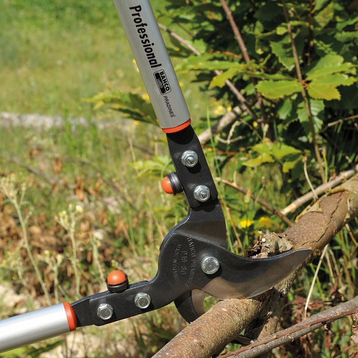 Суцільні обрізки обрізки для видалення товстих жорстких гілок з дерев і лоз. Надзвичайно довгі стабільні алюмінієві трубчасті ручки для різання з високим досяжністю та над головою. Два промені лопатей дозволяють швидко і міцно розрізати гілки, а потім легку і точну обробку різання.