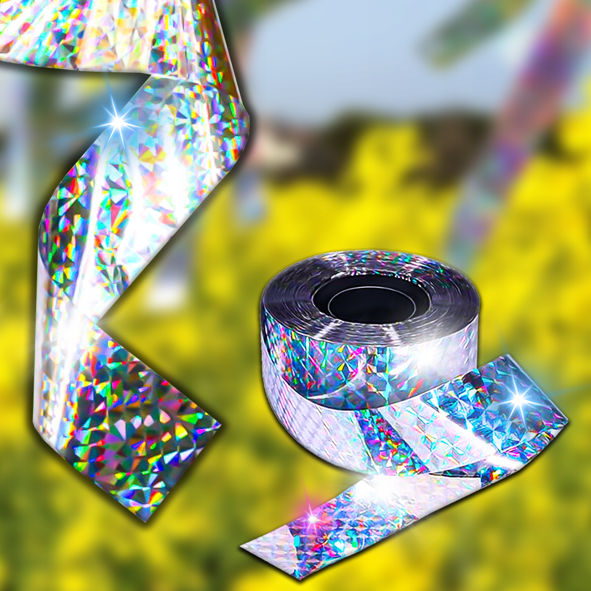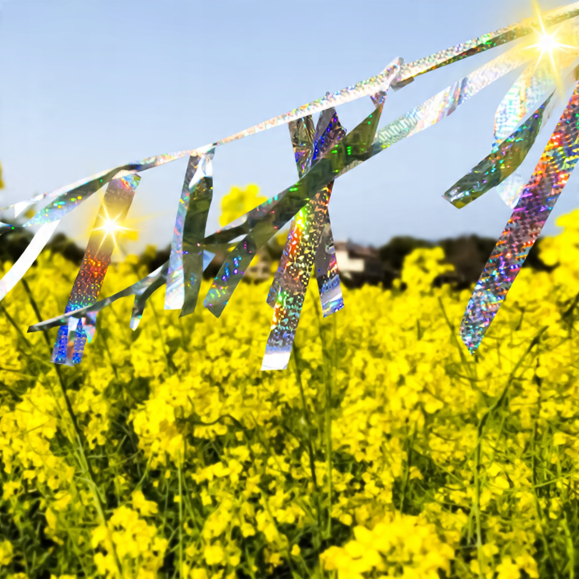 Світловідбиваюча стрічка з мерехтливими кольорами ефективно відлякує небажаних птахів. Ви можете прив’язати його частинами до кіл, залишивши довші шматки, щоб, коли їх роздує вітер, вони додатково захистили посіви.
