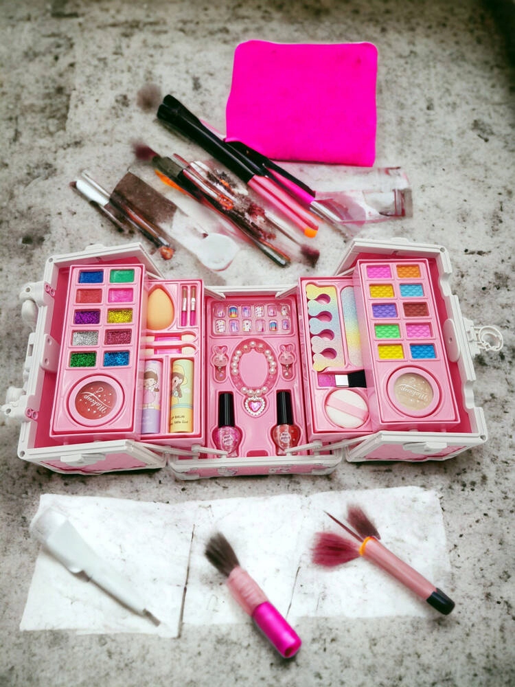 Косметика, що розміщується в дбійці і дуже легко змиваються . Набір розміщували в красивому кріпленому багажнику . У багажник має стильну ручку і є кріплення .