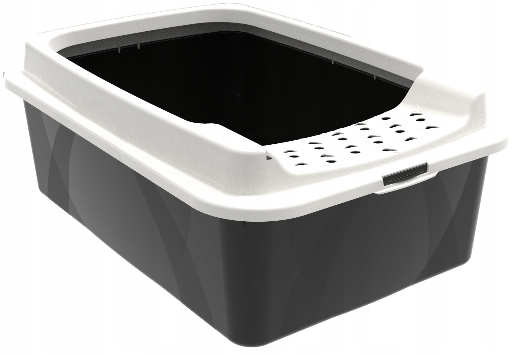 - Сучасний лоток із входом у верхній частині. Також підходить для великих порід завдяки великому отвору. Контейнер широкий і глибокий, що дозволяє кожному коту знайти своє місце. Високі бічні стінки забезпечують захист від протікання. Кришка лотка розроблена таким чином, щоб якомога менше сміття вилітало разом з котячими лапами завдяки маленьким отворам у формі котячих лап. Знімна кришка дозволяє легко чистити.