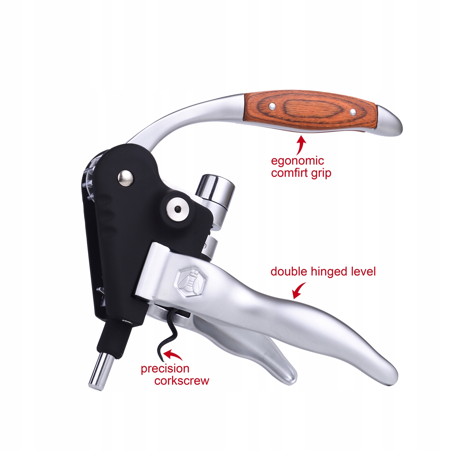 Штопор з важелем, завдяки стійці полегшує відкриття пляшок b>! Використовуючи важільний механізм і раму, ви можете відкривати всі пляшки елегантним способом без ризику зламати пробку. Штопор складається з алюмінієвої та дерев'яної ручки, що забезпечує зручне та легке захоплення. Його система важелів дозволяє легко та безпечно видаляти пробку. Поставляється в красивій коробці кольорів Laguiole, цей штопор стане ідеальним подарунком для любителів вина та посуду! У коробці є запасне свердло.
