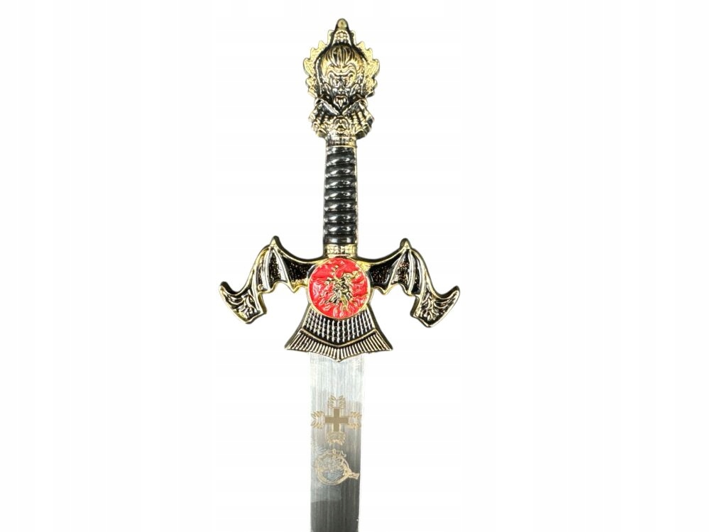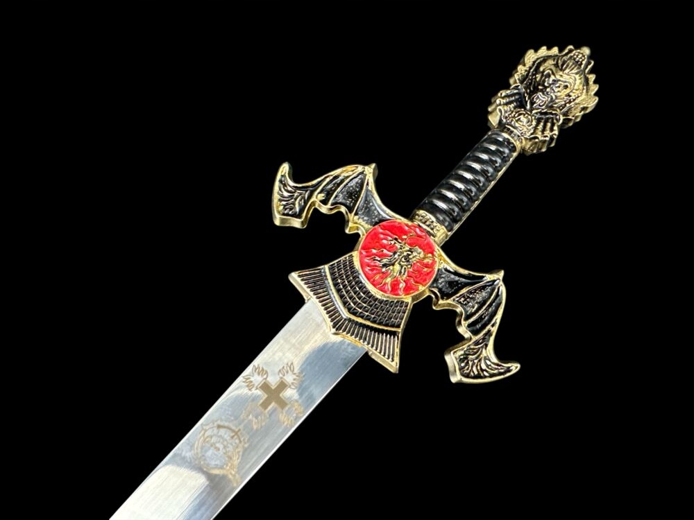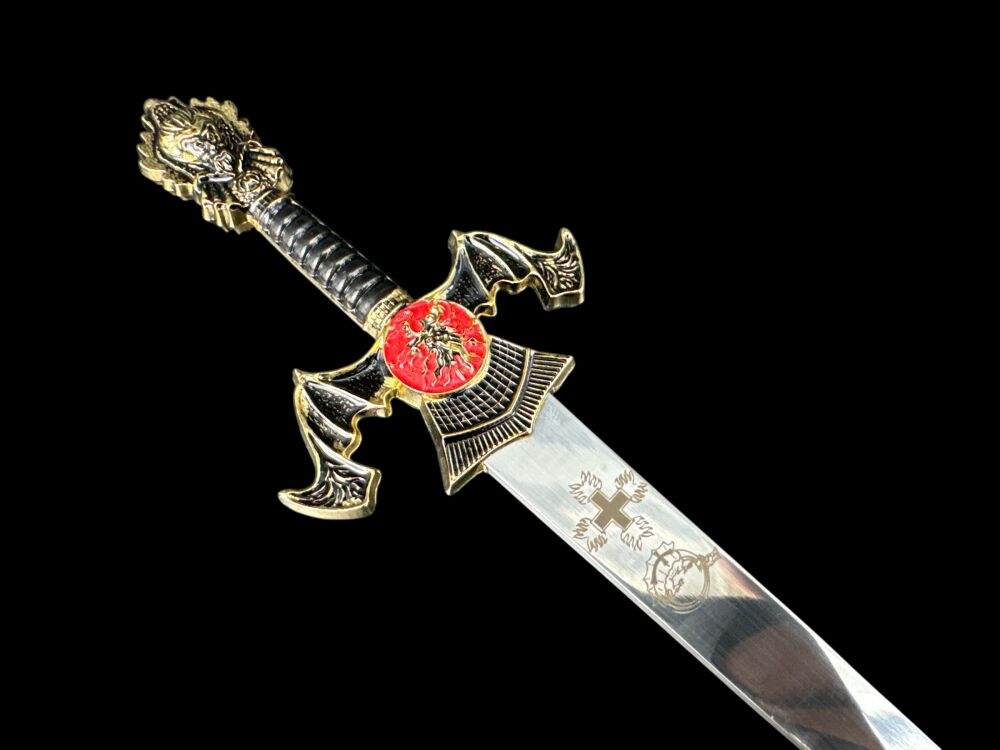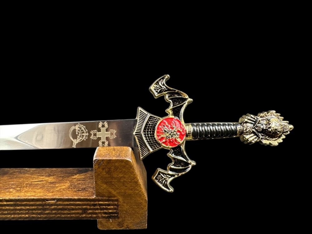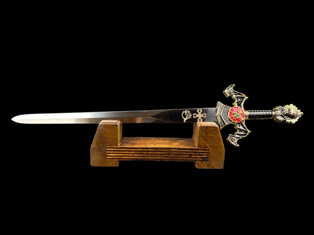 ❇️Кожен елемент цього унікального маленького меча виготовлено з надзвичайною точністю та увагою до деталей. Лезо з нержавіючої сталі прикрашене з обох сторін багатим гравіюванням, пов'язаним з історією та традиціями. Ручка, виконана з металу, не тільки красива, але і зручна на дотик. Багато прикрашена навершя та хрестовина додають всьому величного вигляду, роблячи його справжнім витвором майстерності.