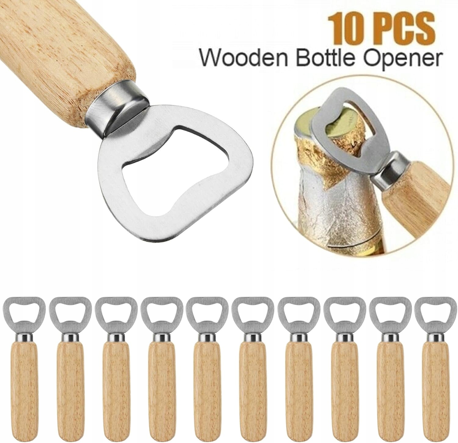 10 дерев'яних відкривачок для пляшок.