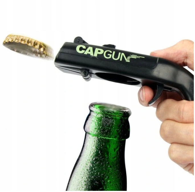 Надзвичайно крутий відкривач для пляшок у формі... дробовика. Мало того, що ефективно відкривається, так ще й досить далеко стріляє кришками :). Вживання пива набуває нового виміру з цією відкривачкою, ви можете не тільки насолоджуватися улюбленим напоєм, але й весело провести час наодинці чи з друзями та довести свою акуратність ;) Просто розтягніть пружину, відкрийте пляшку (кришка буде триматися за магніт), і ви можете натиснути на курок. Однак пам’ятайте, що не можна цілитися в людей або тварин.