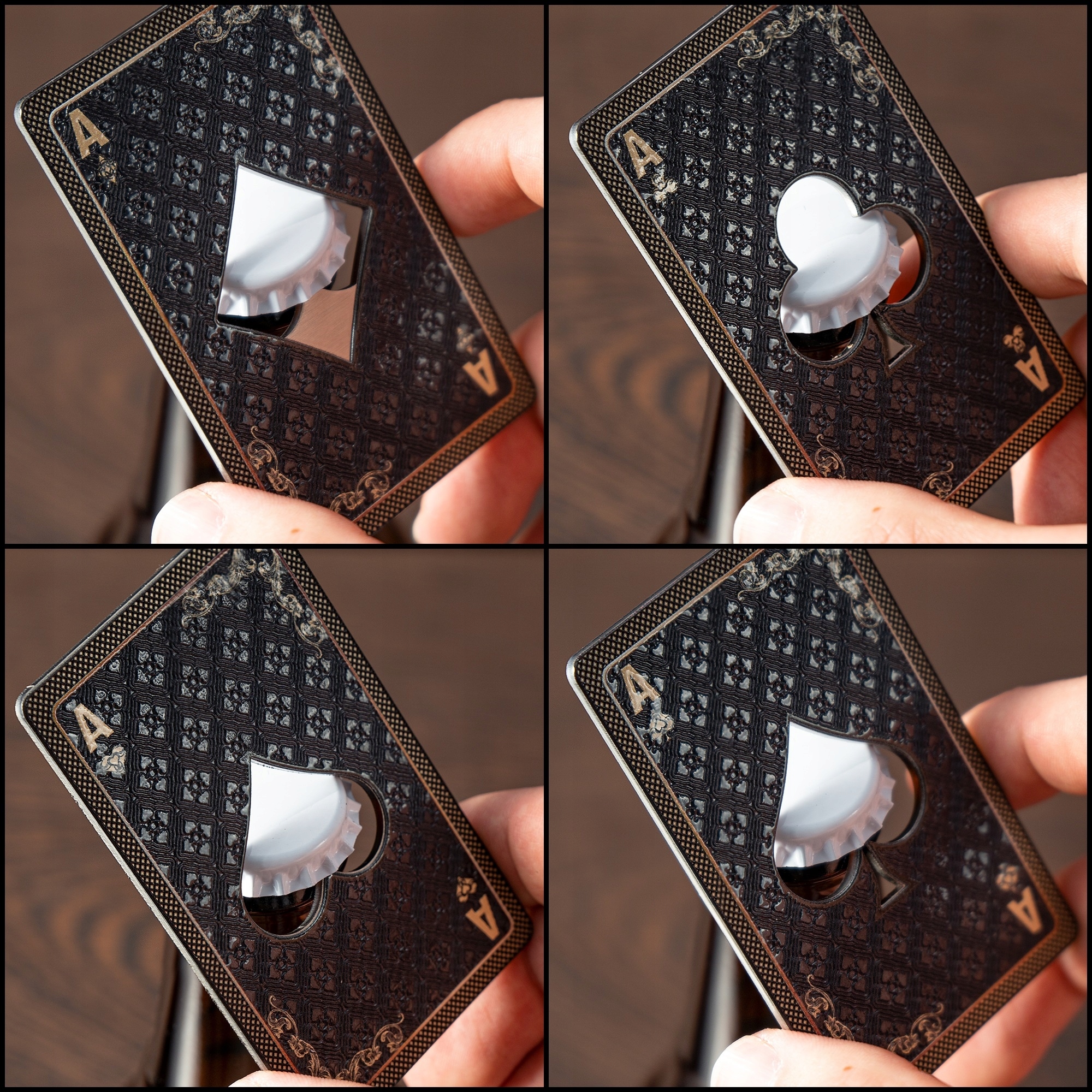 Елегантний відкривач ідеально відображає гральну карту. Відкривати пляшку з ним - це дитяча гра - як грати в карти. Просто вставте кінчик пляшки з кришкою в отвір у центральній частині виробу так, щоб кінець кришки перекривав край отвору.