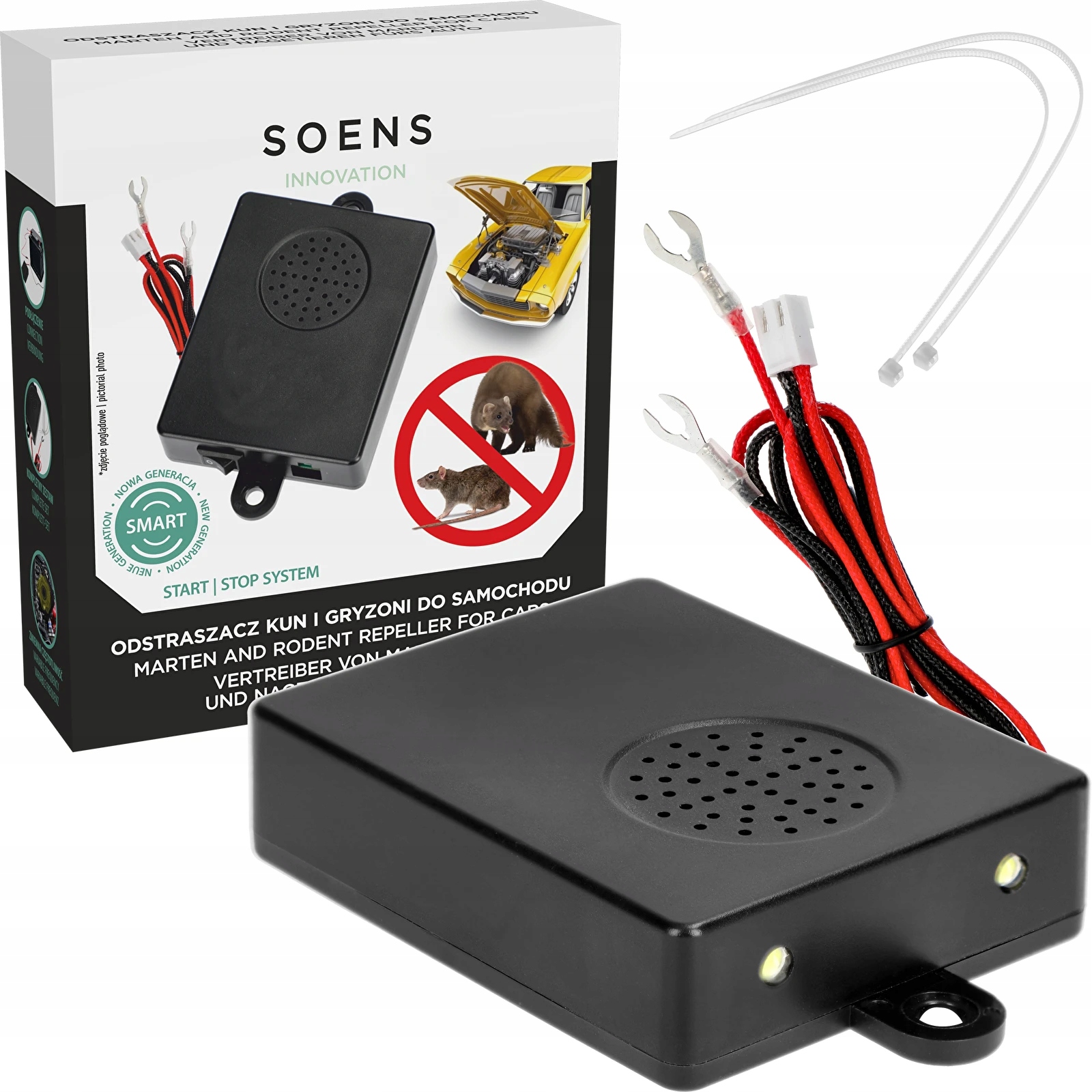 Робота цього відлякувача заснована на випромінюванні ультразвукових сигналів і світлодіодних спалахів. Пристрій утримує непроханих гостей, таких як куниці та гризуни, подалі від вашого автомобіля чи іншого транспортного засобу, не завдаючи їм шкоди.