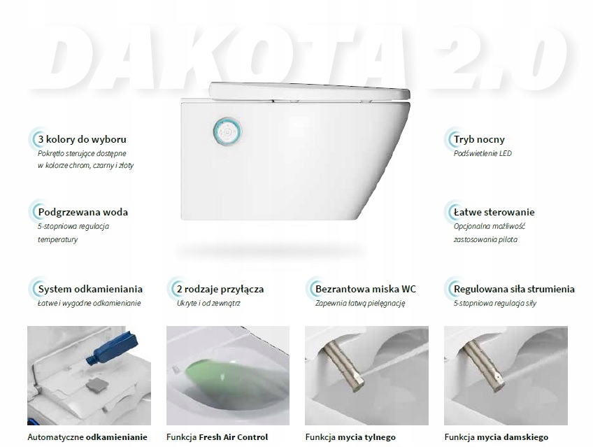 За допомогою зручної ручки управління або пульта дистанційного керування (опція) користувач може змінювати температуру води, силу розпилення та положення форсунки. Унітаз має функцію жіночого миття та заднього миття, які можна в будь-який момент включити та вимкнути. Пристрій має сидіння з механізмом повільного опускання і нічний режим, тобто світлодіодне підсвічування.