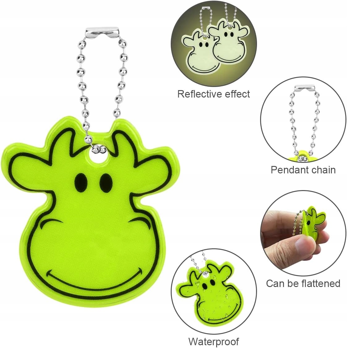 Рефлектори виготовлені з твердого ПВХ, який є водонепроникним, міцним і його легко носити. Тваринний мотив є модним і функціональним, і підвіски працюватимуть за будь-яких погодних умов.