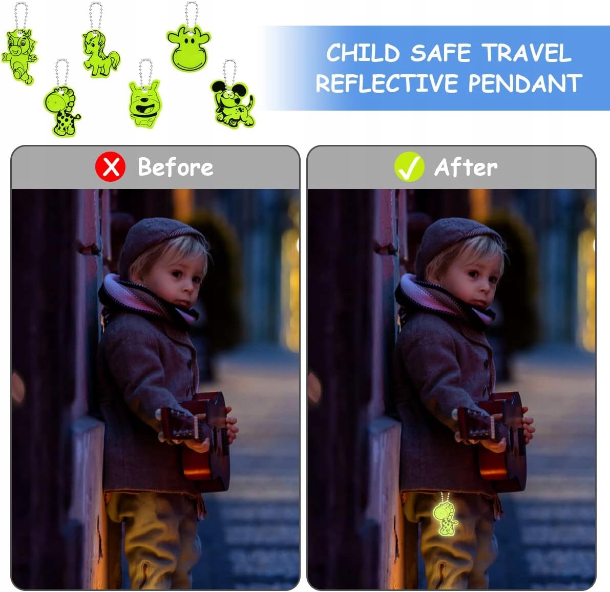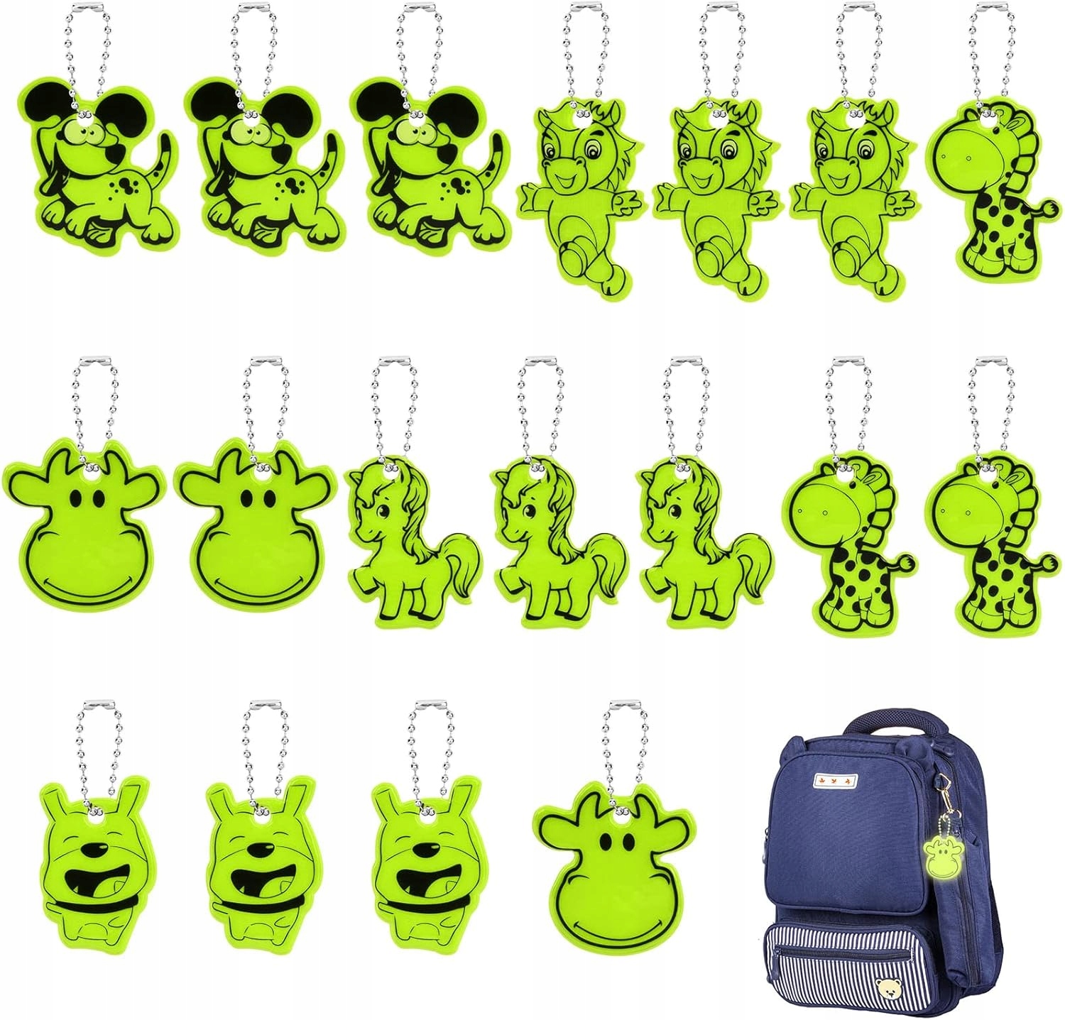 Високоякісний світловідбиваючий матеріал забезпечує чітке відбиття світла, покращуючи видимість дитини в темряві. Набір із 18 світловідбиваючих підвісок захищає від раптових небезпек на дорозі, забезпечуючи безпечніше водіння в темний час доби.