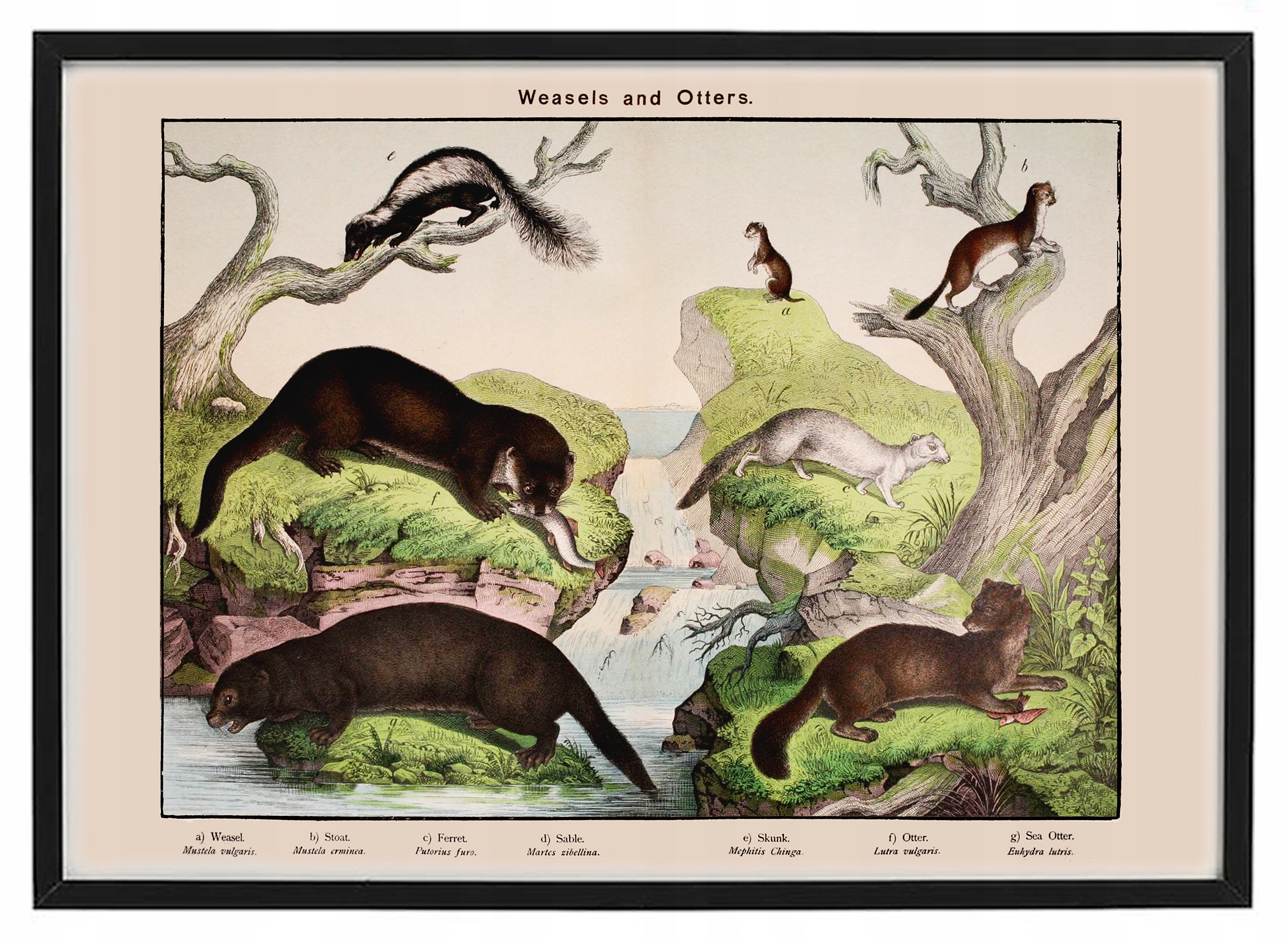 Репродукція старої графіки із зображенням різних видів видр на дуже якісному папері з благородною ніжною текстурою дрібних смужок і великою вагою 270 г.