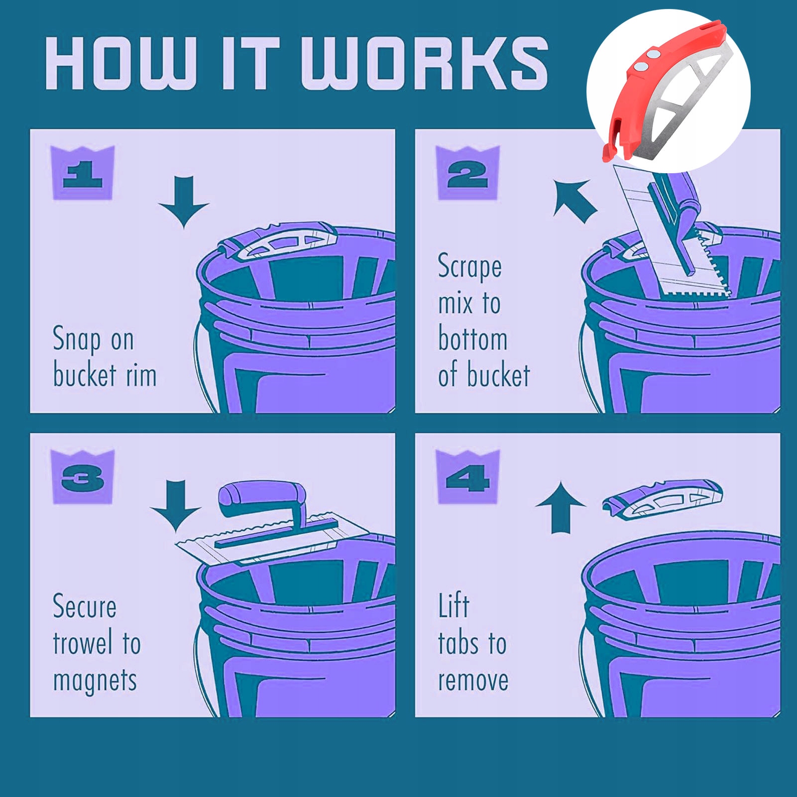 1. Лопата для плитки: надійно кріпиться до стандартних 5-галонних відер і її легко використовувати будь-де на робочому місці. Він спеціально розроблений для монтажників плитки, дозволяючи їм зішкребти клей із дна ковша.