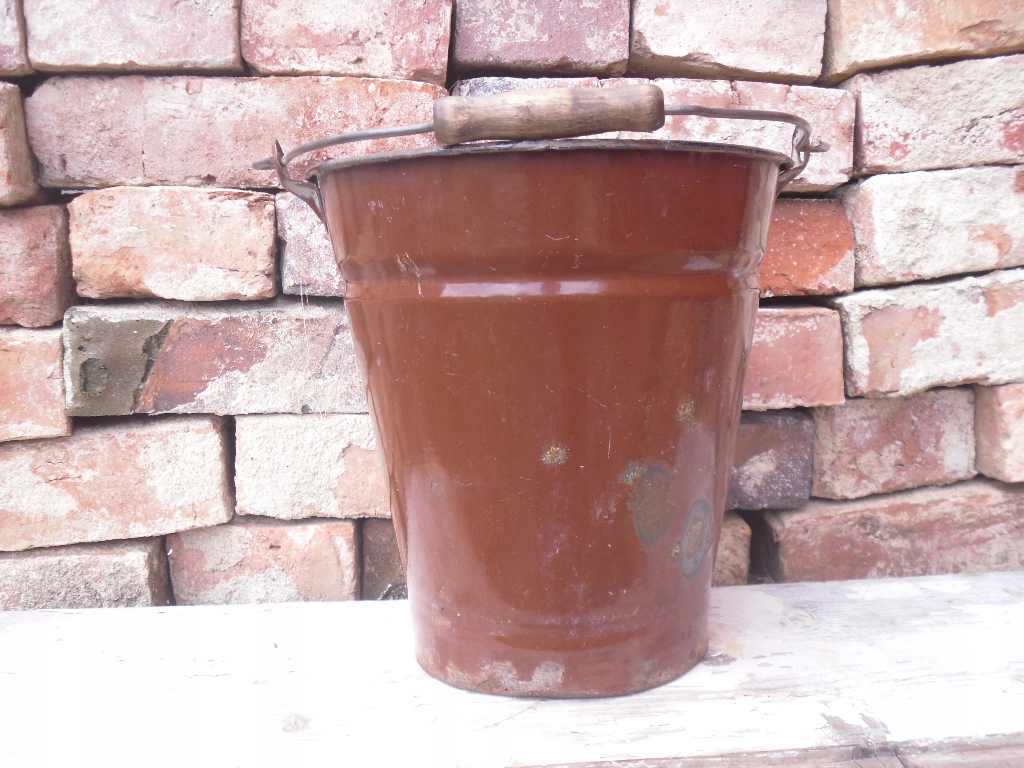 Ласкаво просимо на мій аукціон. На аукціонах я зазвичай пропоную вам речі часів Польської Народної Республіки. На цьому аукціоні пропоную ОРИГІНАЛЬНЕ старе маленьке емальоване відро. Відро коричневе, з світло-блакитним центром і чорним обідком. ТУГЕ відро. Відро має кілька вм'ятин від емалі на нижньому та верхньому краях, а також невеликі подряпини, знебарвлення та потьмяніння, див. фотографії. Відро очищене і нічим не захищене (за бажанням можу захистити і змастити), тільки дерев'яна ручка, захищена деревним воском. На фото все видно. Відро ПІДПИСАНО. /див. фото/.