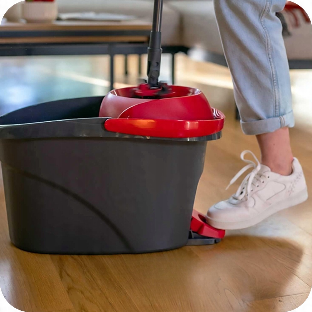 VILEDA Easy Wring Ultramax Turbo полегшить прибирання в кутах та інших важкодоступних місцях завдяки рухливому наконечнику швабри, навіть під меблями. Відро в наборіVILEDA Easy Wring Ultramax Turbo оснащене поворотним механізмом і правильно профільованим кошиком, завдяки якому ви зможете швидко злити зайву воду зі швабри. Щоб активувати механізм, просто натисніть ногою кнопку, розташовану на відрі.