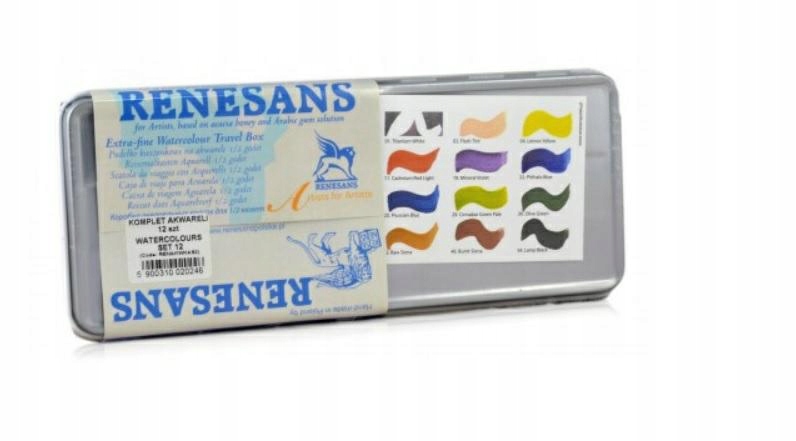 Відродження акварелі -це високоякісні, професійні акварельні фарби польської марки, що виробляються на основі арабської гуми та меду, Набір містить 12 фарб у напівцентрі 1,5 мл, Завдяки високоякісним пігментам кольори насичені та стійкі до світла. Ціле в міцній металевій касеті, Кольори включені: 1 титановий білий / титановий білий, 2 tinta ciegly / flesh tint, 3 перська жовчна / перська жовта, 7 Cadmia cadmia / cadmium geet Deep (оригінал), 10 cinnober / vermilion, 12 Скарлет / Скарлет, 19 Індіго / Індіго, 20 прусський синій / прусський синій (Берлінський синій), 32 зелень кобальту / кобальт -зелений (оригінальний), 34 Золотий -Зелений / Золотий зелений, 48 Sepia / Sepia, 54 Чорна сажа / лампа Чорна.