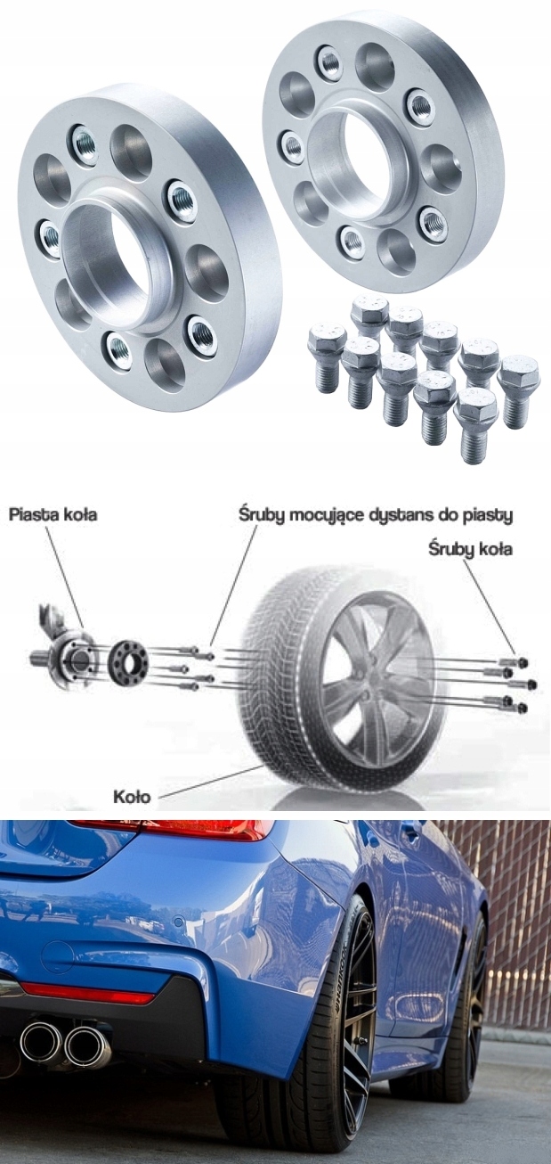 Оригінальні розпірки осі з гвинтами. Високоякісний продукт, виготовлений в Німеччині з міцного, міцного дюралюмінієвого сплаву. Збільшена колія коліс і спортивний вигляд – лише деякі з переваг прокладок, зчеплення автомобіля з дорогою на поворотах також значно покращується, встановлення не викликає жодних проблем.