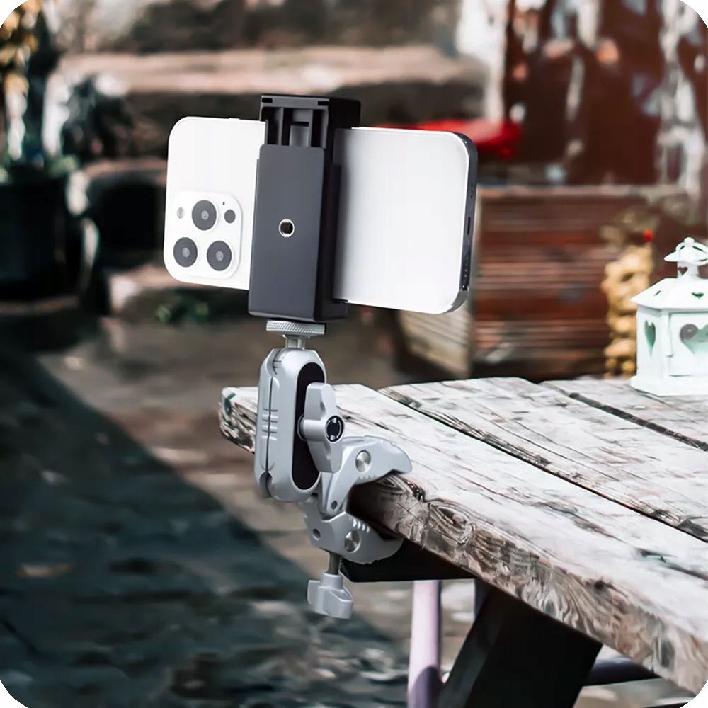 ✔️ Затискач дає нам багато варіантів кріплення в студії та за її межами. Затискач-метелик регульований і дуже міцний, тож ми можемо його регулювати до об’єктів різної товщини, наприклад стільниці, паркану, гілки, труби, керма, скейтборду тощо.