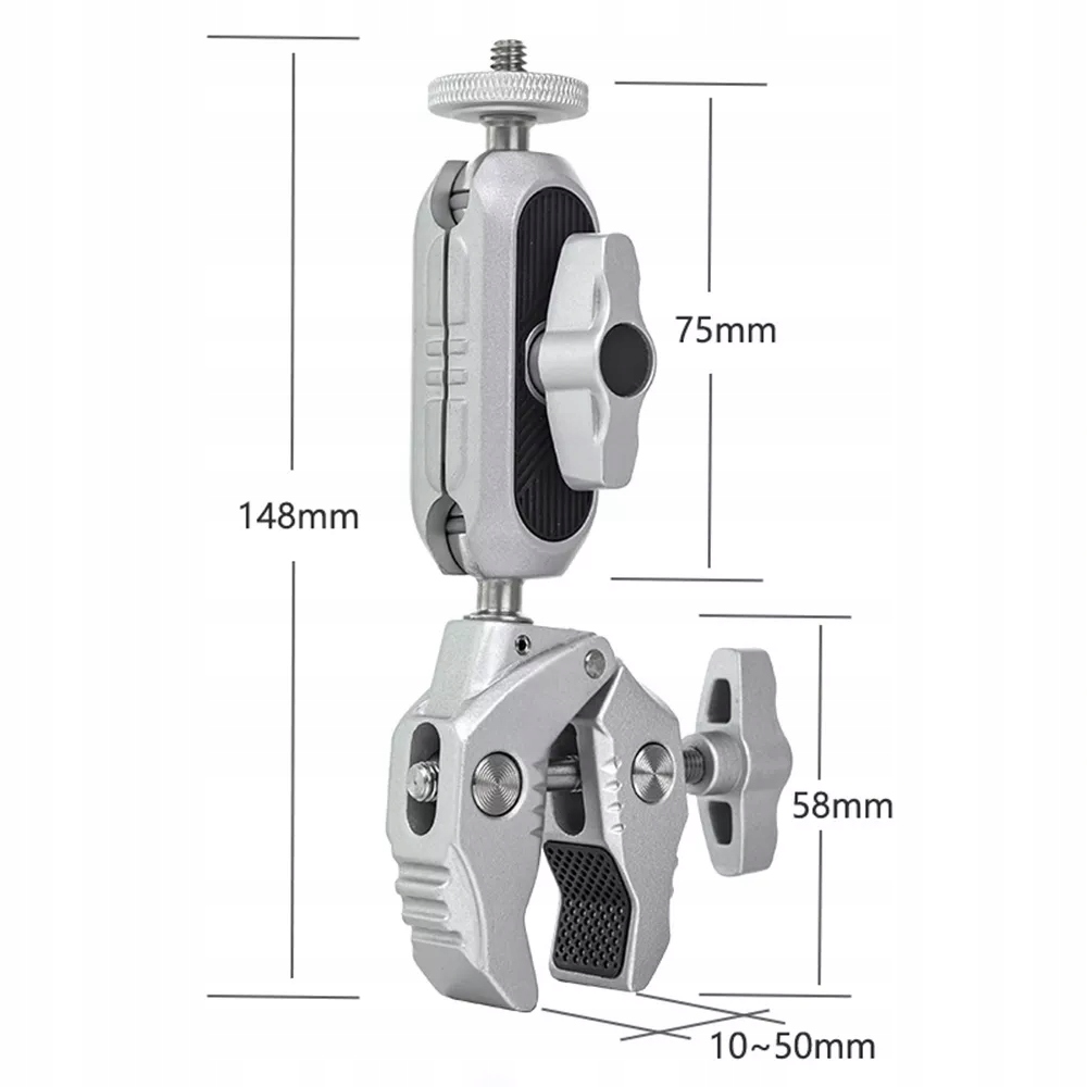 ✔️ Тримач має стандартну різьбу 1/4". Внутрішня різьба 1/4" на задній частині затискача дозволяє легко встановити невелику камеру, монітор , світлодіодне відеосвітло, мікрофон або спалах. Після використання відповідного адаптера тримач може працювати з камерою GoPro. Завдяки міцному фіксатору головки метелика кріплення надійне та стабільне.