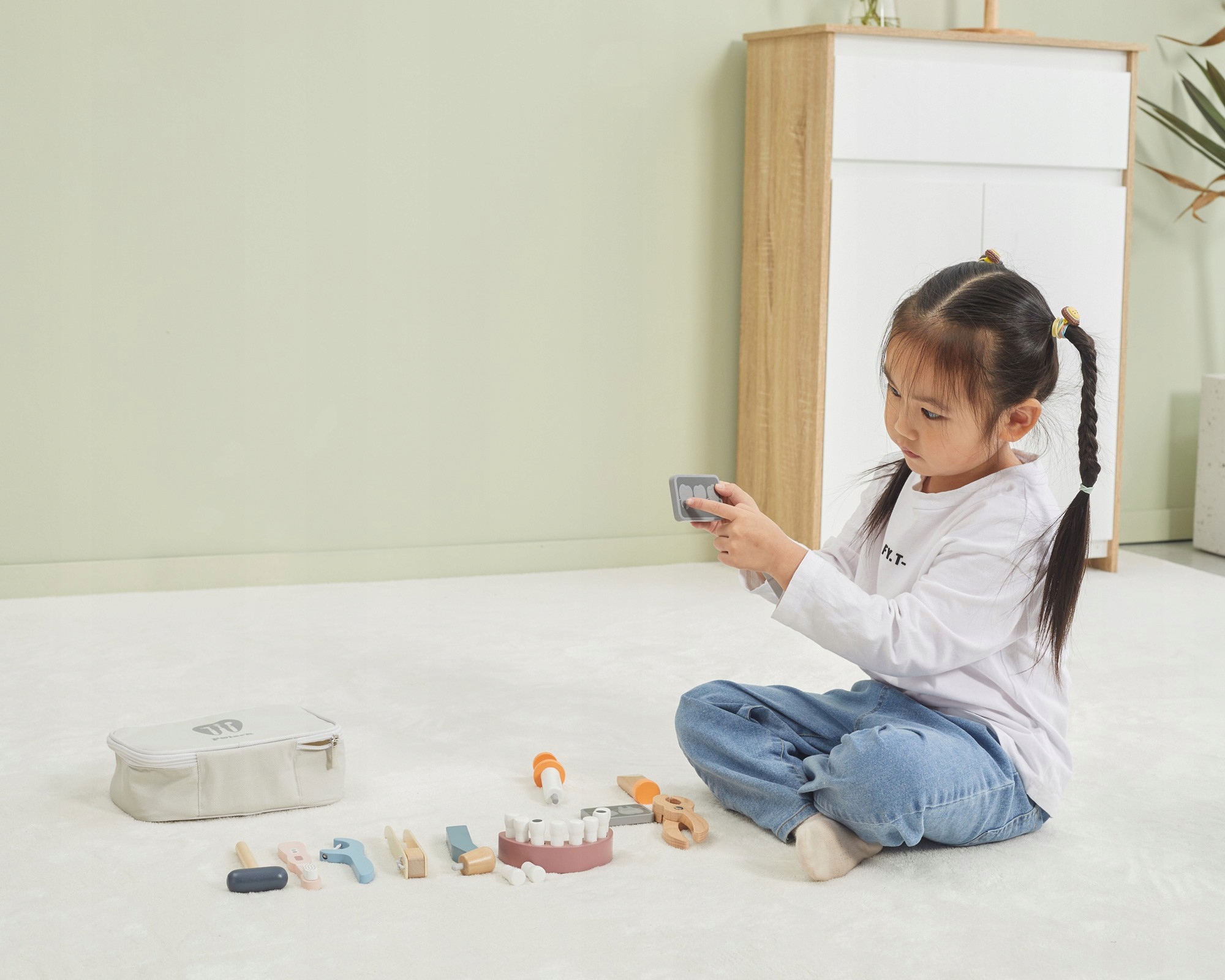 Wooden Dentist Set із серії PolarB від бренду Viga є одним із них тих іграшок, які через рольову гру допоможуть дитині позбутися страху та набути впевненості в собів стресових ситуаціях, які можуть чекати на неї в майбутньому. Візити до стоматолога можуть стати легшими та приємнішими, коли ваш страх перед стоматологічним обладнанням зникне. У набір входить зручна сумка з набором дерев'яних іграшок, в тому числі: набір зубів (включаючи два додаткових), бормашина, кусачки для видалення зубів, зубна щітка, зубна нитка, пінцет, рентген, дзеркало, молоток і тюбик зубної пасти. p>
