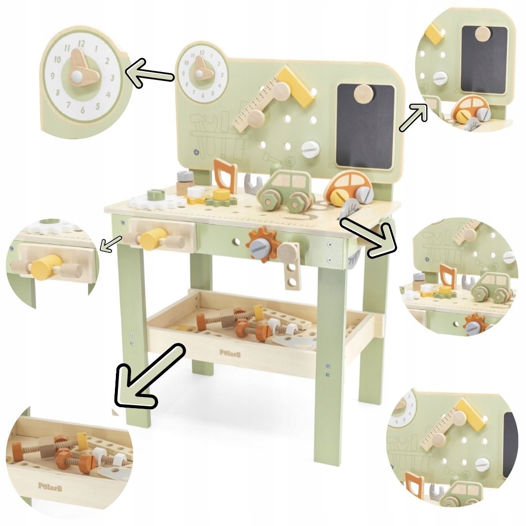 DIY Workshop від бренду Viga Toys з ексклюзивної серії PolarB виготовлятиме Ви відчуваєте свою дитину справжнім механіком. Дитина може забивати цвяхи, закручувати шурупи гайковим ключем, пригвинчувати дерев'яні дошки та шестерні до верстака. В іграшці є годинник зі стрілками, дерев'яні машинки та різні інструменти.