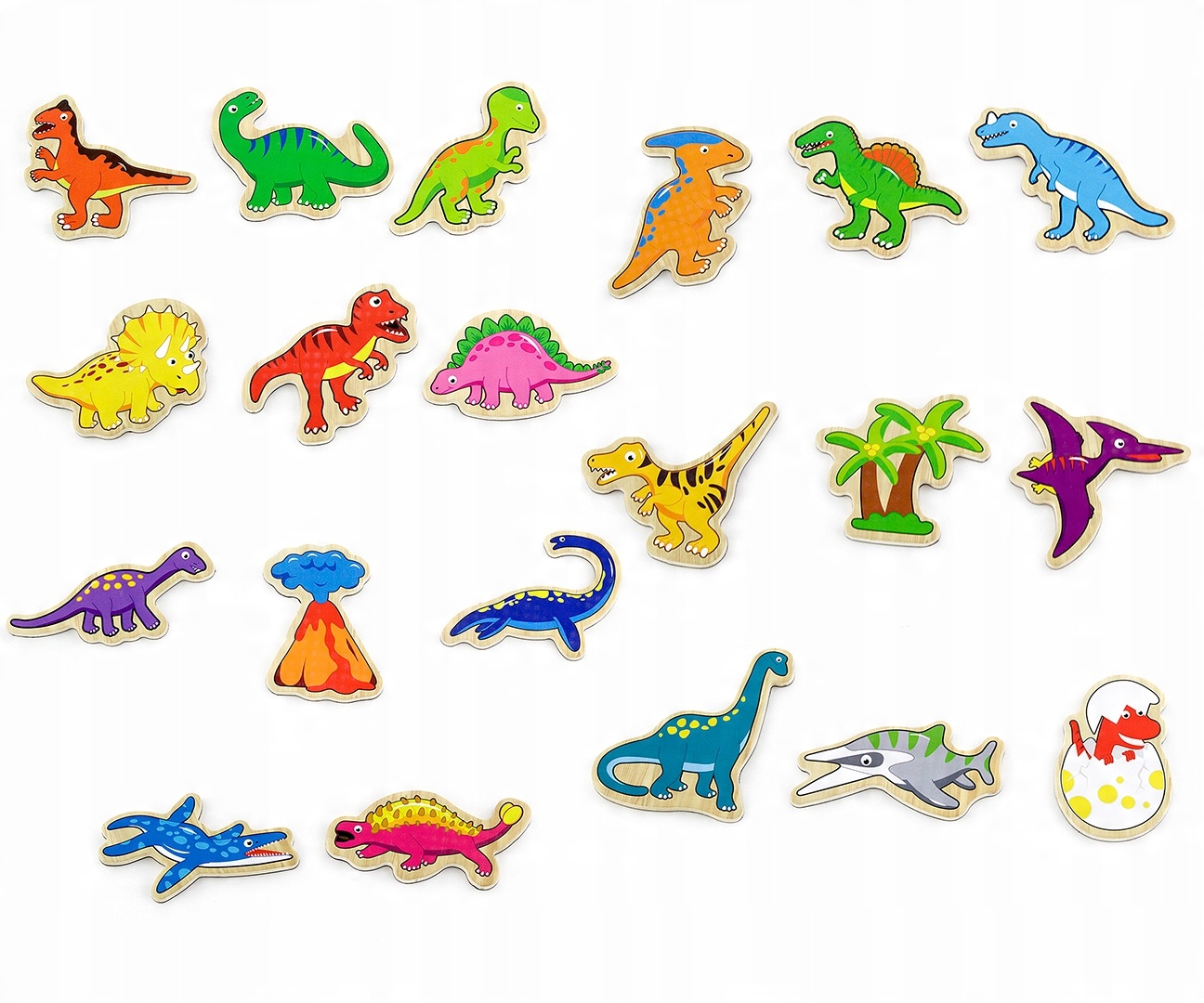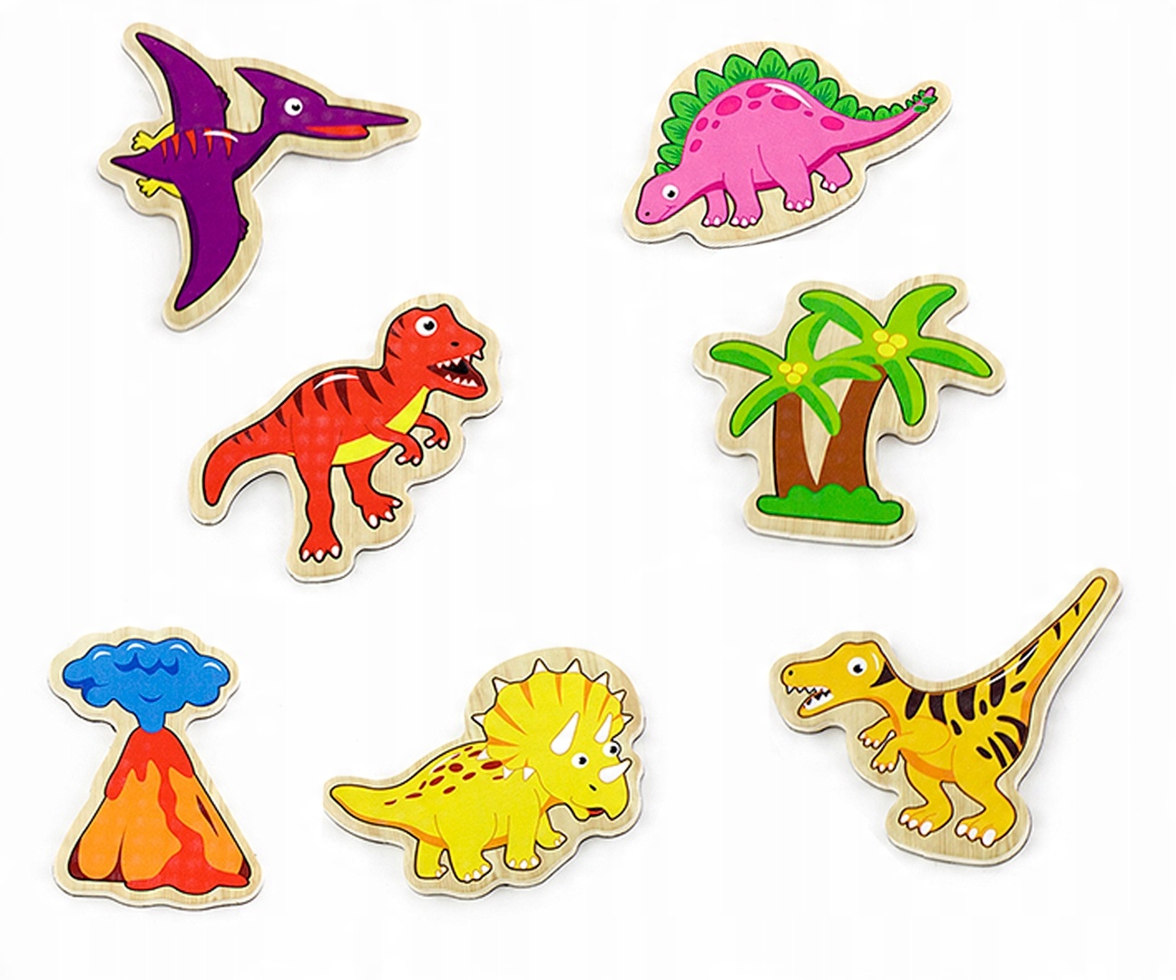 Серед магнітів ми знайдемо різнокольорових динозаврів із їхніми власні кольори.привернуть увагу дитини. Набір включає: 18 різнокольорових динозаврів (включно з такими видами, як стегозавр, трицератопс, птеродактиль, Т-рекс, алозавр та багато інших), вулкан і пальму.