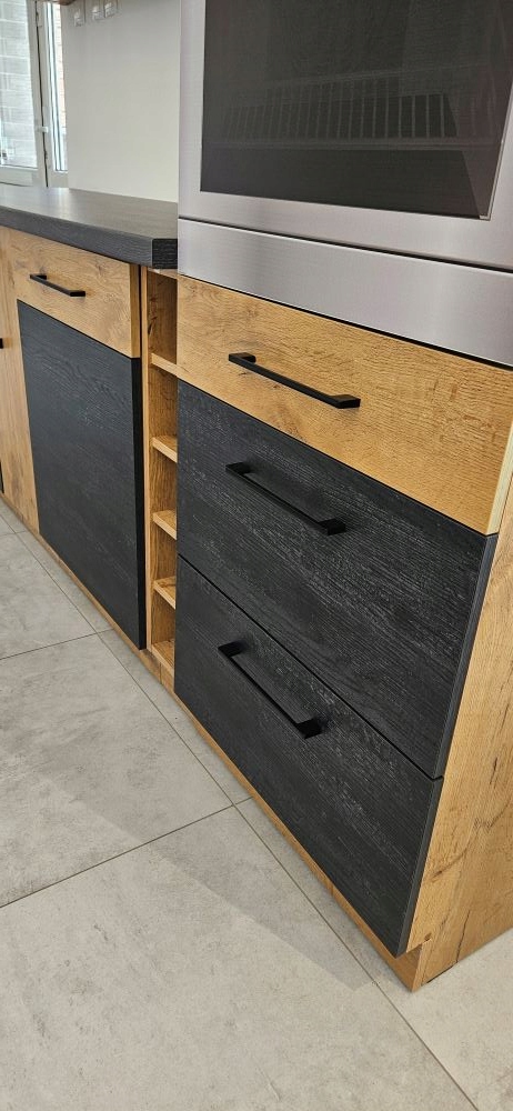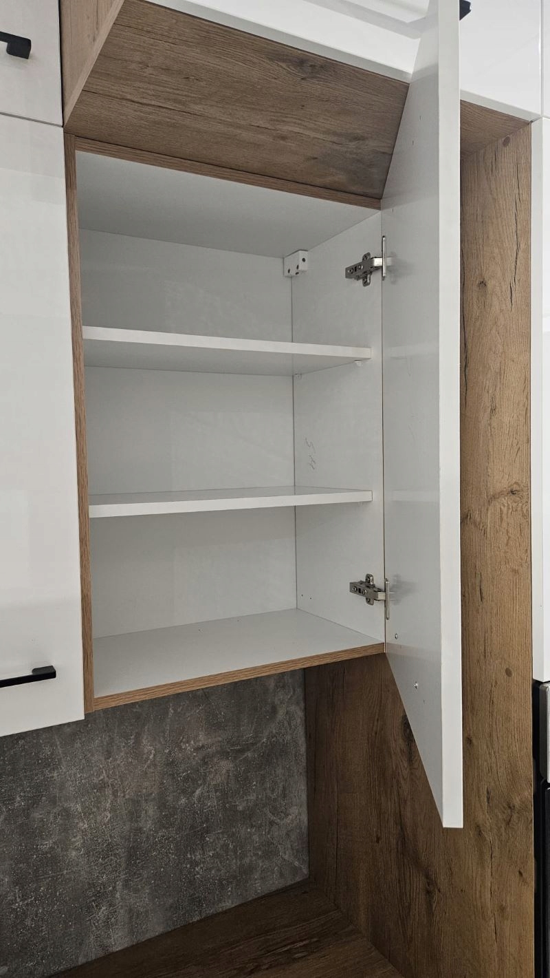 - Висота нижньої шафи 82 см - Немає регулювання висоти, шафи стоять на слайдах (чорний -1 см), що застрягло в сторони кожного шафи