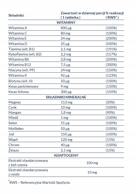 Склад: карбонат кальцію; наповнювач: целюлоза мікрокристалічна; оксид магнію; екстракт кореня женьшеню (Panax Ginseng), стандартизований до мін. 20% гінзенозидів; карбонат магнію; L-аскорбат кальцію; DL-альфа-токоферилацетат; магнієві солі лимонної кислоти; піколінат цинку; глазурувальник: жирні кислоти; амід нікотинової кислоти; ферум(ІІ) глюконат; глазурувальник: гідроксипропілметилцелюлоза; йодистий калій; глюконат марганцю; селеніт натрію; глазурувальник: магнієві солі жирних кислот; ретинілпальмітат; Кальцію D-пантотенат; холекальциферол; екстракт гриба рейші (Ganoderma lucidum), стандартизований до мін. 35% полісахаридів; купрум(ІІ) глюконат; менахінон; глазурувальник: діоксид кремнію; екстракт кореня імбиру (Zingiber officinale), стандартизований до мін. 5% гінгероли; піридоксину гідрохлорид; тіаміну мононітрат; рибофлавін; глазурувальник: поліетиленгліколь; фітоменадіон; піколінат хрому; молібдат натрію; птероїлмоноглутамінової кислоти; D-біотин; метилкобаламін.