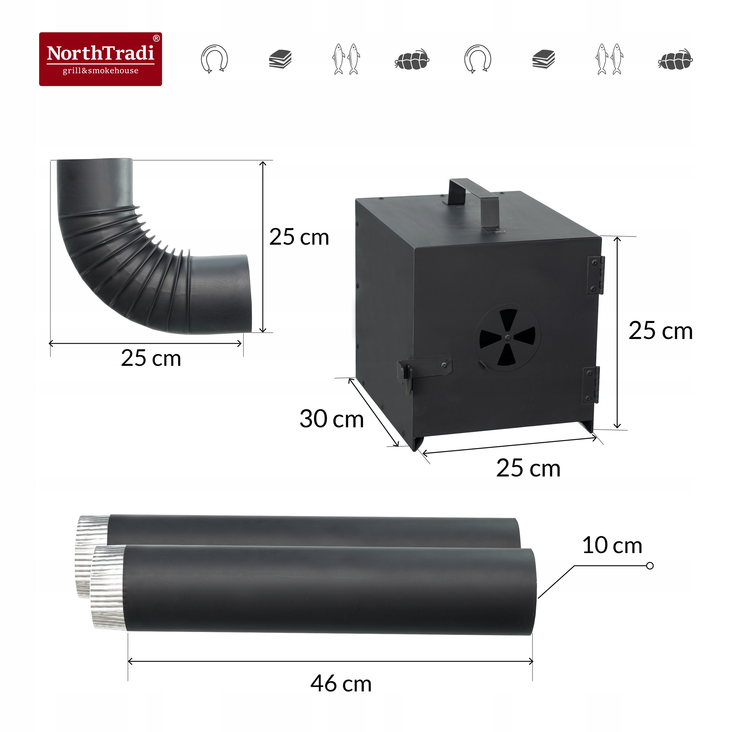 Суцільне вогнища - це серце кожної коптильної. У комплекті з трубами та коліном, це створює готовий набір, який дозволить вам швидко запустити власне місце для куріння. Northtradi Smokerset XL - це довговічність, точність та повний контроль над димом.