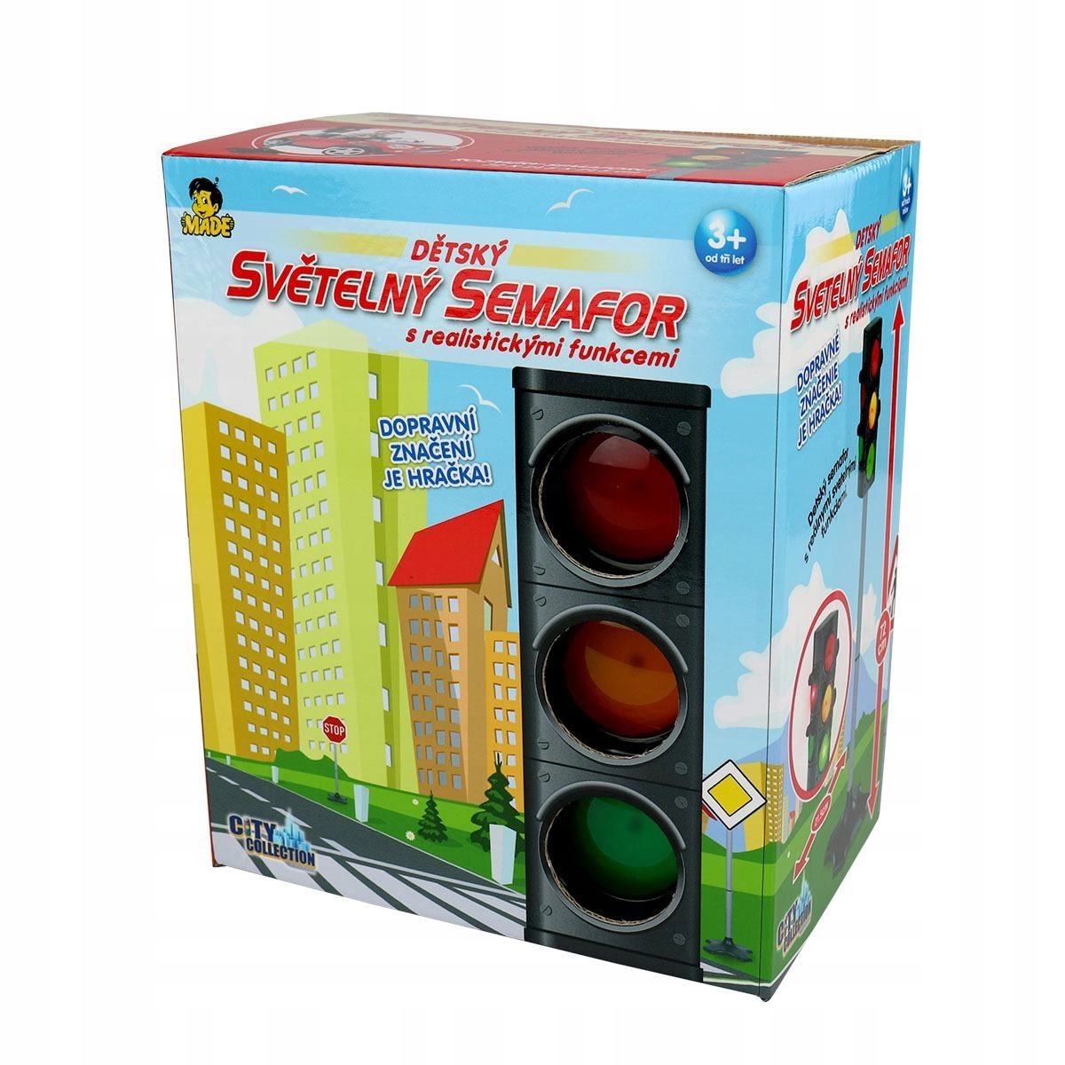 Він функціонує з усіх чотирьох сторін, включаючи дві сторони для автомобілів і дві для пішоходів. Регулюється на висоту 36 і 72 см. Діти можуть навчитися сприймати правила проїзду на перехресті або там, де потрібен освітлювальний прилад.