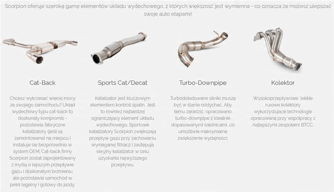Вихлопні системи Scorpion характеризуються відмінними конструкційними властивостями, нетрадиційним дизайном і найвищою якістю виготовлення, що призводить до помітних переваг як у продуктивності, так і в надійності. Окрім унікального звуку, системи Scorpion забезпечують більше потужності, вищий крутний момент і набагато легші, ніж стандартні вихлопи.