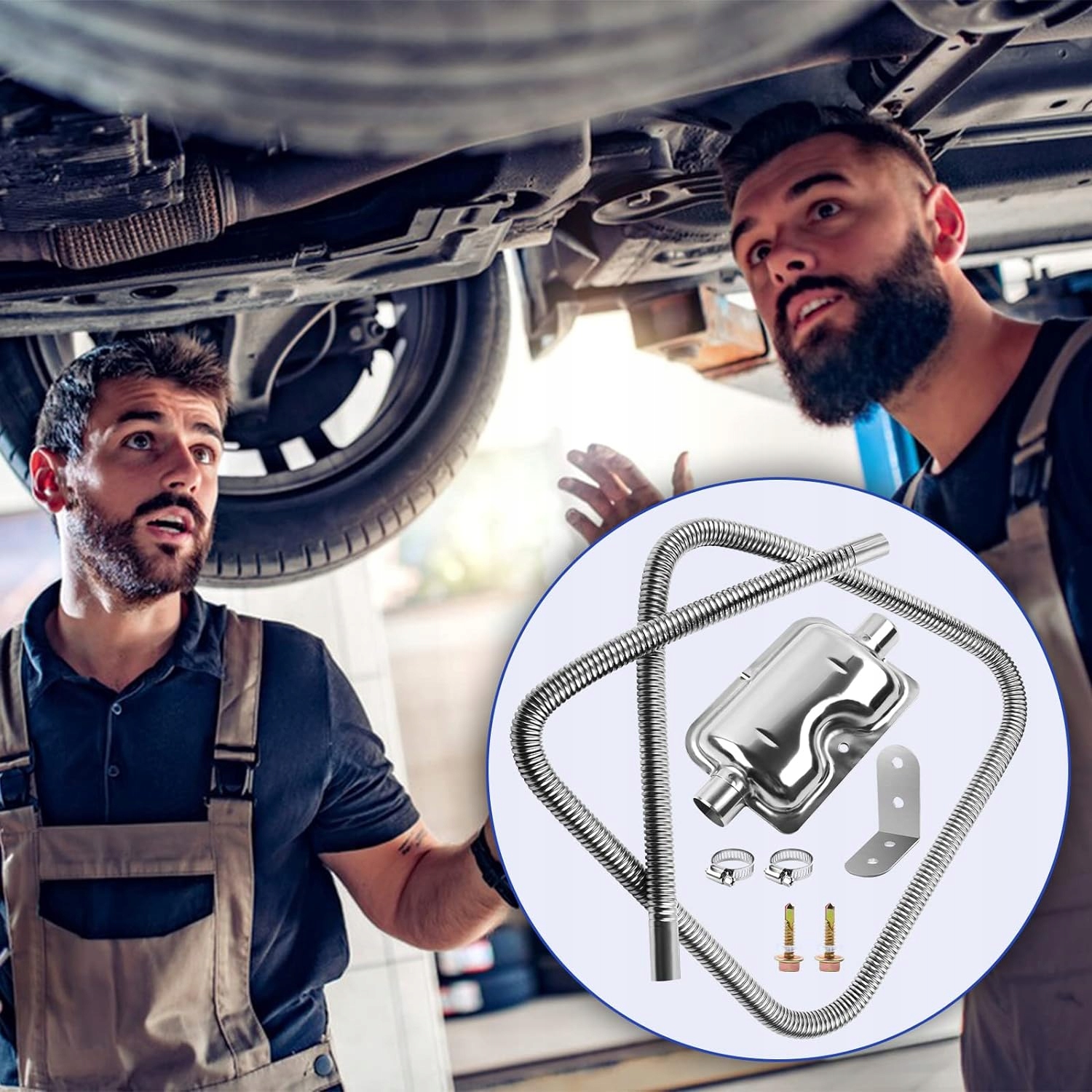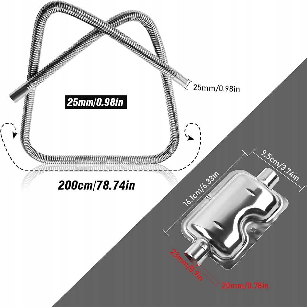 ви отримаєте додатковий вихлопний шланг опалення довжиною 200 см (приблизно 78,7 дюймів) і діаметром 25 мм (приблизно 1 дюйм) і глушник з нержавіючої сталі. Є також два затискачі з нержавіючої сталі, за допомогою яких ви можете краще прикріпити вихлоп додаткового нагрівача, щоб забезпечити ідеальне ущільнення.