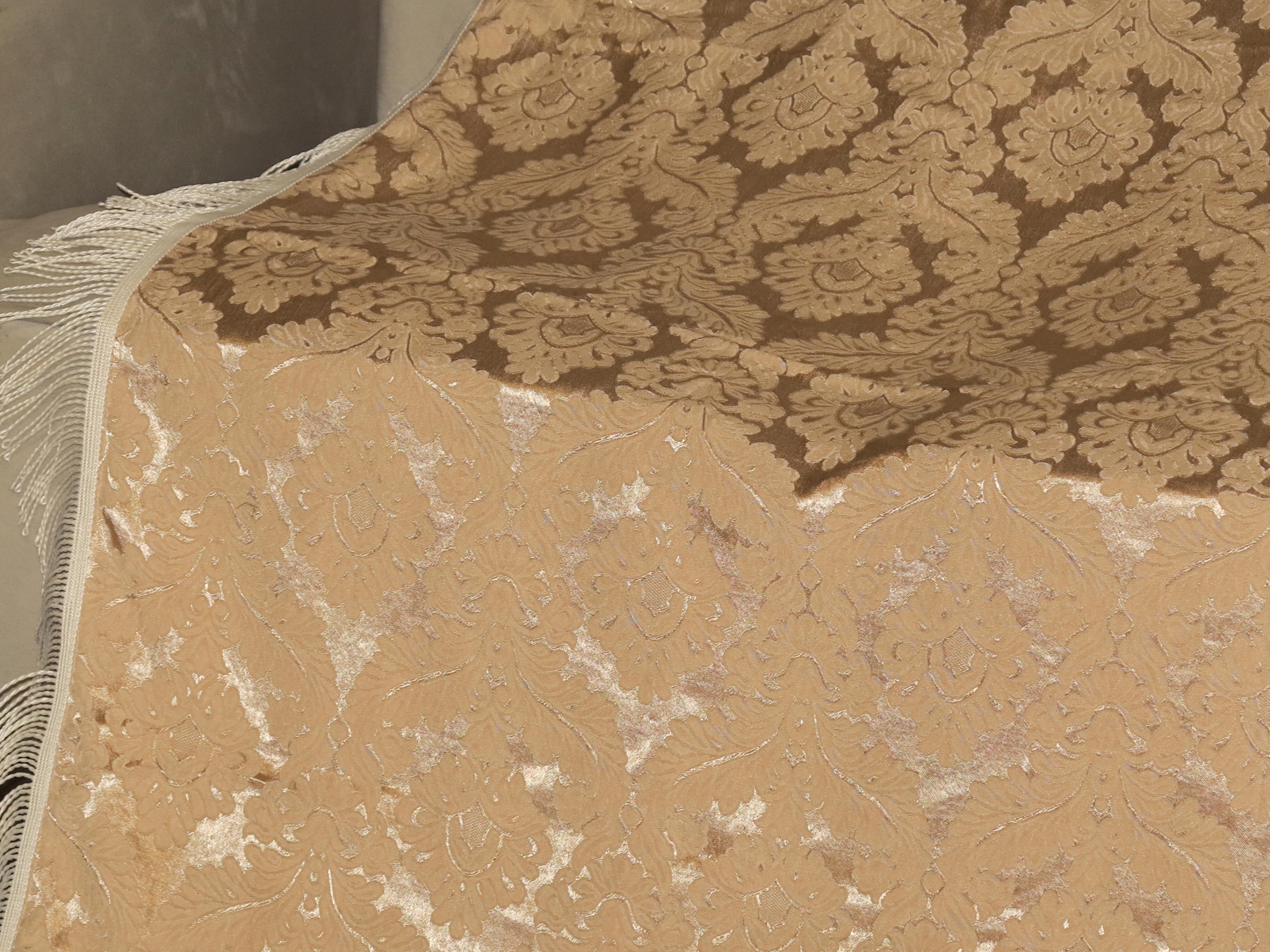 НАДЗВИЧАЙНУ КРАСИВУ ВЕЛИКУ СТИЛЬНУ СКАТЕРТИНУ З БАВОВНЯНОГО ЖАККАРДУ ВИСОКОЇ ЯКОСТІ, З ВИЗІЛЕНКОМ AQANTO. ГЛЯНЦЕВИЙ ФОН, МАТОВІ ВІЗЕРУНКИ. БЕЖЕВИЙ КОЛІР З СВІТЛИМ ВІДТІНКОМ ПЕРСИКА/ ПО НАВКОЛАМ ДЕКОРАЦІЯ СВІТЛО-БЕЖЕВОЮ БАРАМОЮ.