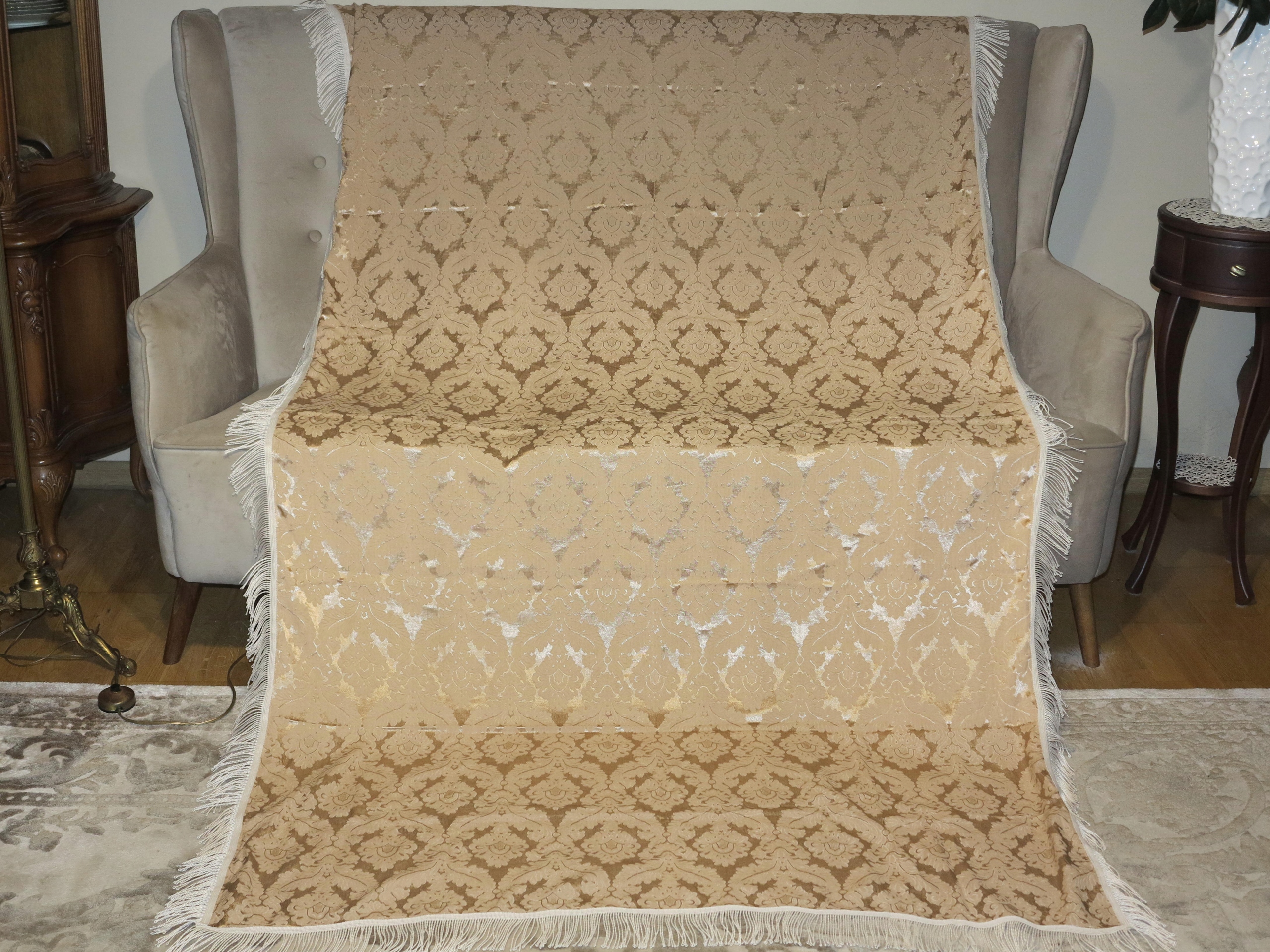 Предмет аукціону - надзвичайно красива, стильна скатертина з високоякісної жакардової тканини з тисненим малюнком аканта. Навколо довгі бахроми. Скатертина має розміри: 218/129 см плюс бахрома приблизно 7 см. Скатертина б/у, в дуже хорошому стані. Рекомендую