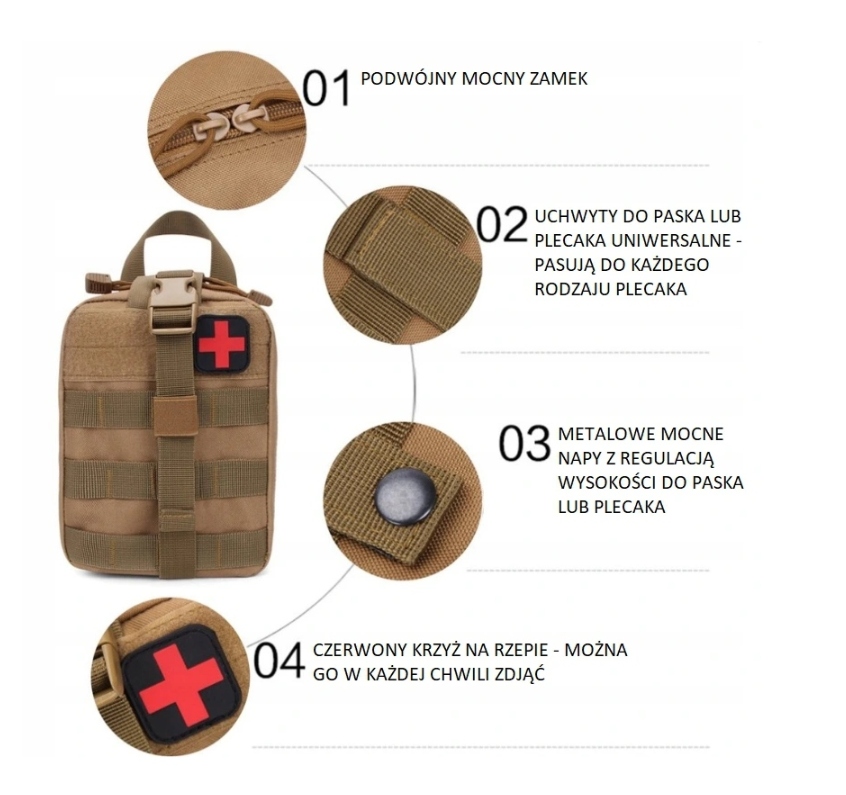 - липучки в нижній частині аптечки (встановлюються в багажнику або рюкзаку, щоб аптечка не рухається)