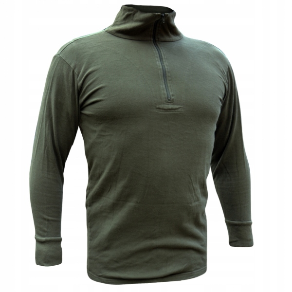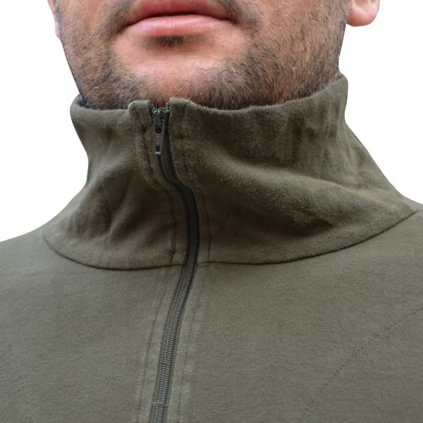 Оригінальна облягаюча футболка Бундесверу з довгим рукавом. Виконана в оливковому кольорі (відтінок може відрізнятися від представленої моделі на фото). Має високий комір на блискавці. Рукава оброблені манжетами.