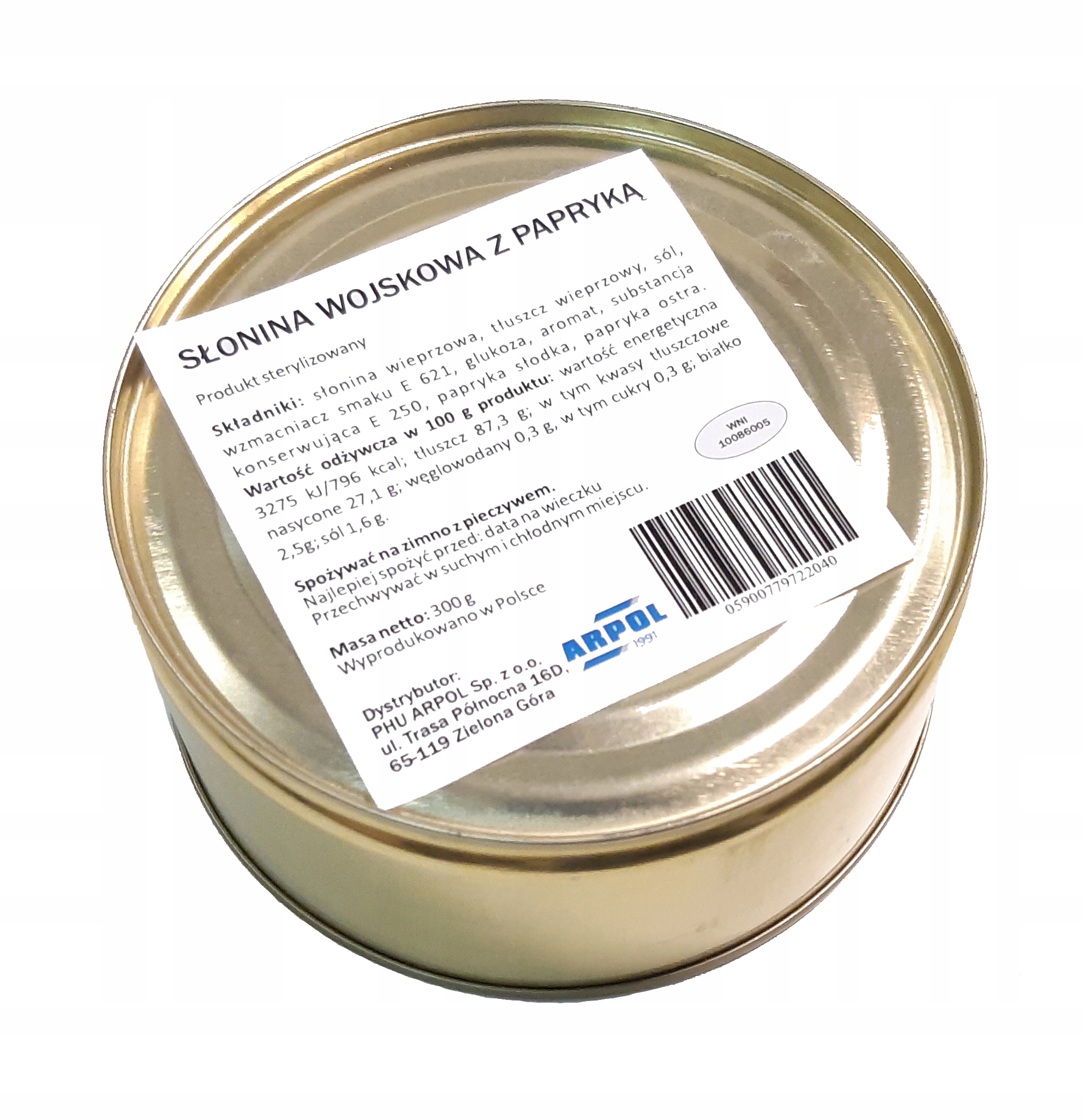 Значний військовий бекон, традиційний рецепт і смак, який цінували покоління солдатів. Свіжа продукція, смачна та ароматна, довгоочікуваний смак, що пам'ятає часи Польської Народної Республіки. Бекон - зовсім інший продукт, ніж сало, ніжний, тане в роті і легше засвоюється. Консерви з високим вмістом жиру, їдять холодними, переважно з хлібом. Бекон можна використовувати для смаження, після смаження він дає шкварки.