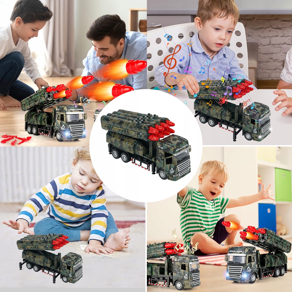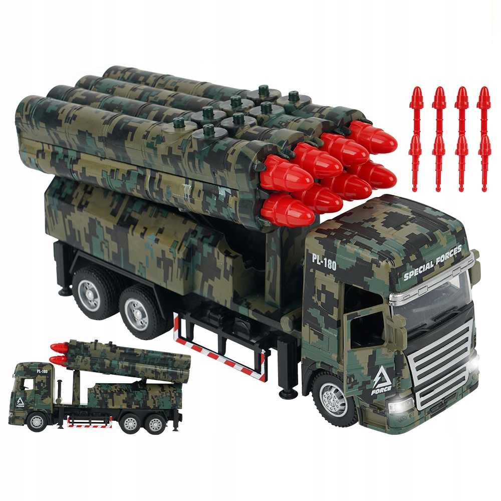 Цей іграшковий військовий віз оснащений 16 ракетами, які можна заряджати, розвантажувати та стріляти. Башта може підніматися на 45°.