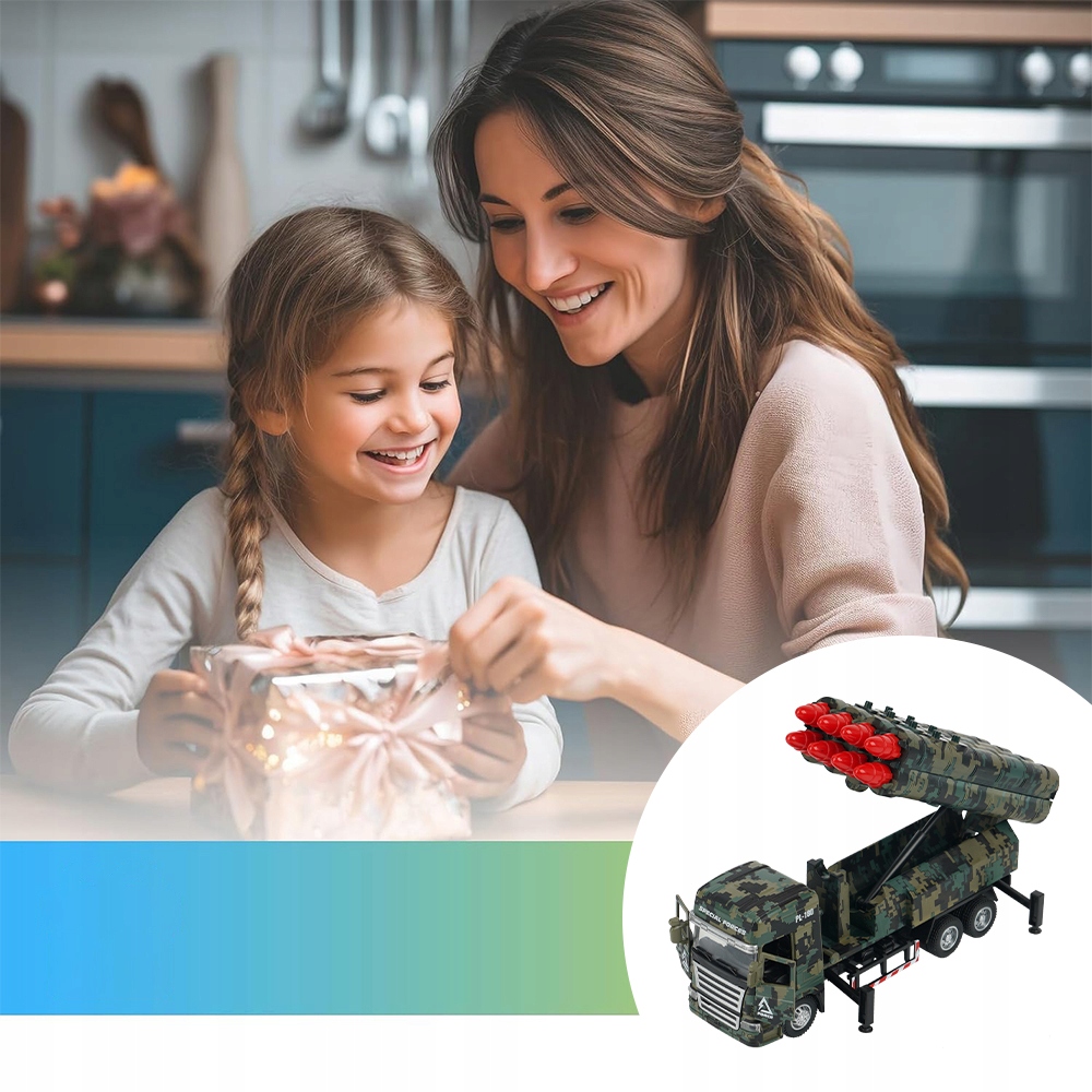Цей військовий автомобіль іграшки оснащений 16 кулями, які можна зарядити, вивантажити та запустити. Башта може піднятися на 45 °.