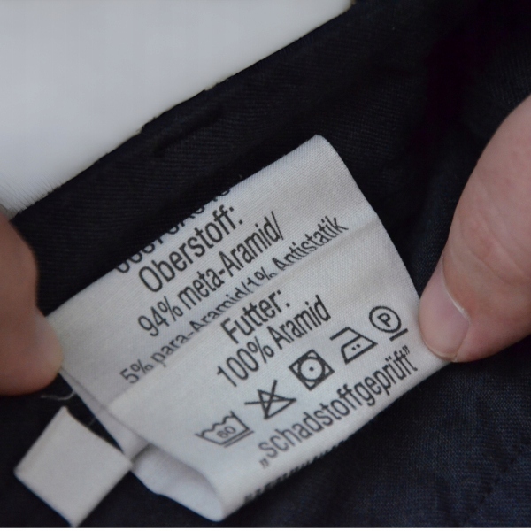 штани виготовлені з жорсткого -військового військового матеріалу, який забезпечує додатковий захист від пожежі та механічних пошкоджень. Примітка : Порія означає уповільнення процесу згоряння та спонтанного гасіння матеріалу, але не повного не випуску.