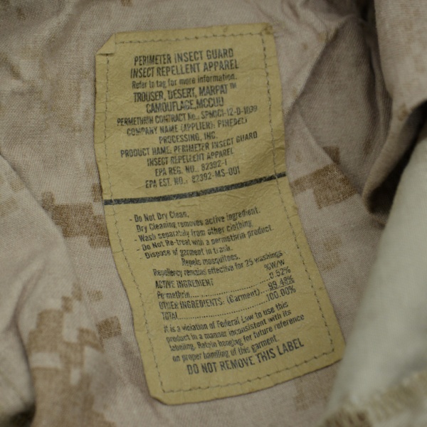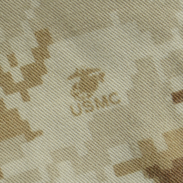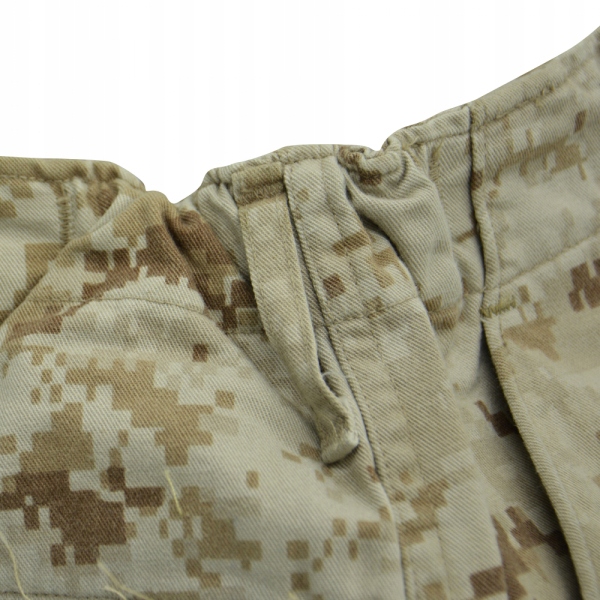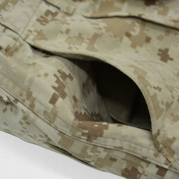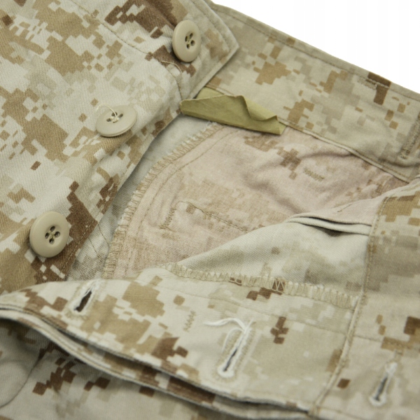 Оригінальні штани з ресурсів армії США. Виготовлений із міцного та вогнестійкого матеріалу nyco (50% бавовна, 50% нейлон) у камуфляжі MARPAT (цифровий пустельний камуфляж). Цей візерунок був створений завдяки комп’ютерному аналізу фотографій місцевості, тому його часто називають «цифровим». Завдяки скупченням крихітних кольорових плям, схожих на пікселі, силует розбивається та зливається з кольоровим шумом навколишнього середовища. Використовується морською піхотою.