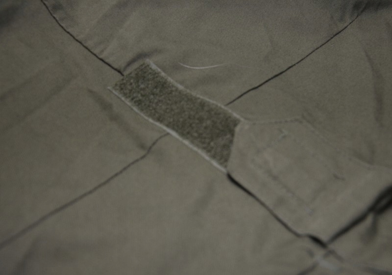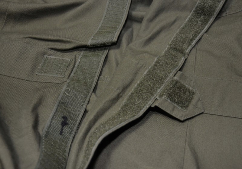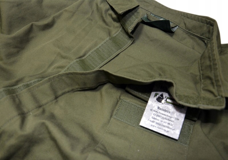 Чоловічий суцільний комбінезон оливкового кольору застібається спереду на суцільну липучку (також можуть бути на ґудзиках). У нього є багато місць, де ми можемо налаштувати його схеми. Регулювання за допомогою манжетів на липучках відбувається внизу рукавів і штанин, ззаду на рівні талії. Комбінезон має одну кишеню зліва на грудях, дві класичні кишені на рівні талії та одну глибоку кишеню на лівому коліні. Всі кишені застібаються на липучки, в костюмі відсутні кнопки. Плечові ремені також застібаються на липучки.