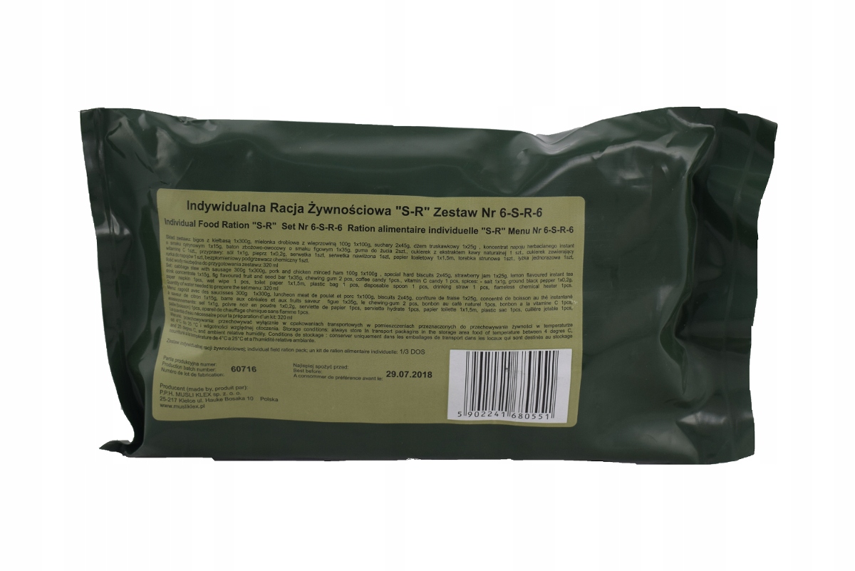 Просматривая «Военный корм S-R № 6», вы можете быть уверены, что данный товар из каталога «[rubrica_name]» будет доставлен из Польши и проверен на целостность. В цене товара, указанной на сайте, учтена доставка из Польши. Внимание!!! Товары для Евросоюза, согласно законодательству стран Евросоюза, могут отличаться упаковкой или наполнением.