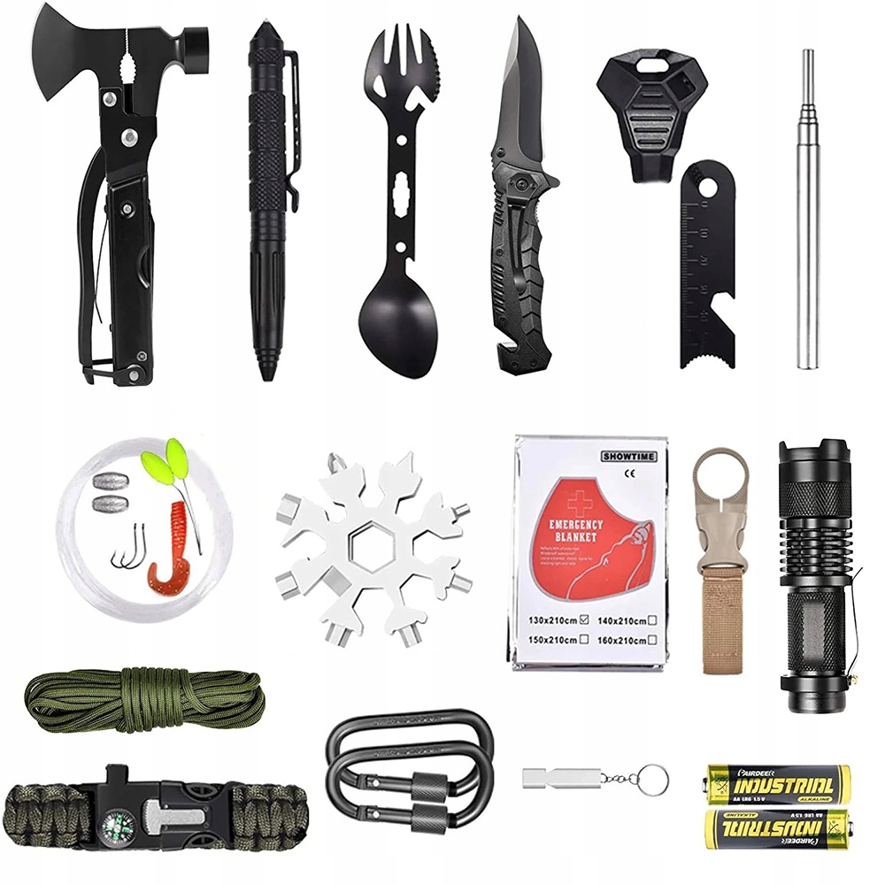 Цей набір інструментів для виживання на природі 30-в-1 є необхідним екстреним спорядженням для пригод на природі, кемпінгу, походів та інших видів діяльності. Містить різноманітні практичні інструменти для різноманітних надзвичайних ситуацій, що робить його ідеальним подарунком для любителів активного відпочинку, військовослужбовців, туристів, туристів, мисливців і тих, хто часто подорожує.
