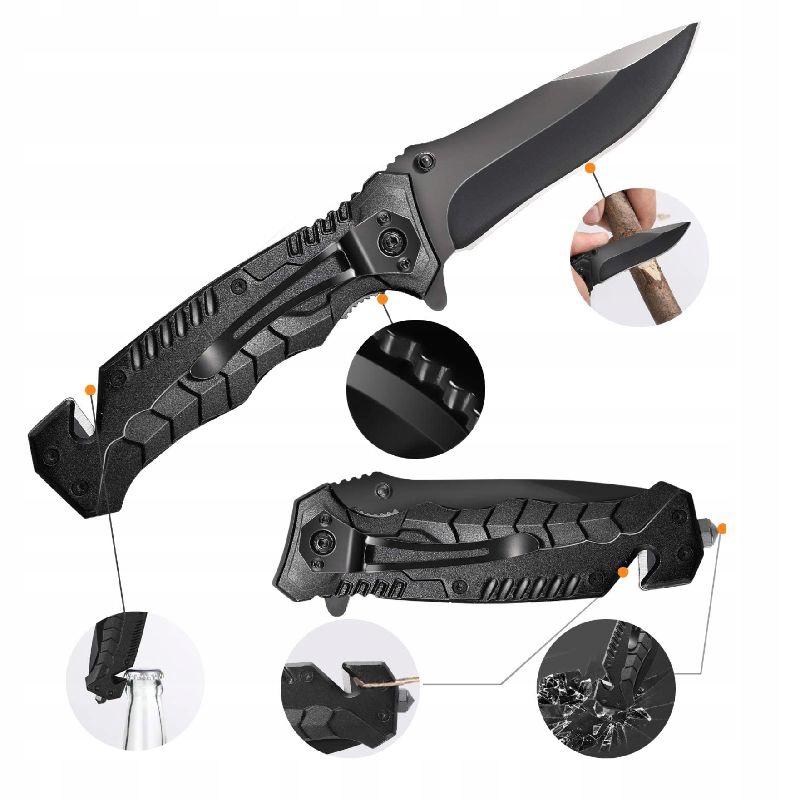 - Складний ніж із блокуванням леза, додаткове різання руху, затискач ременів і розбиваються