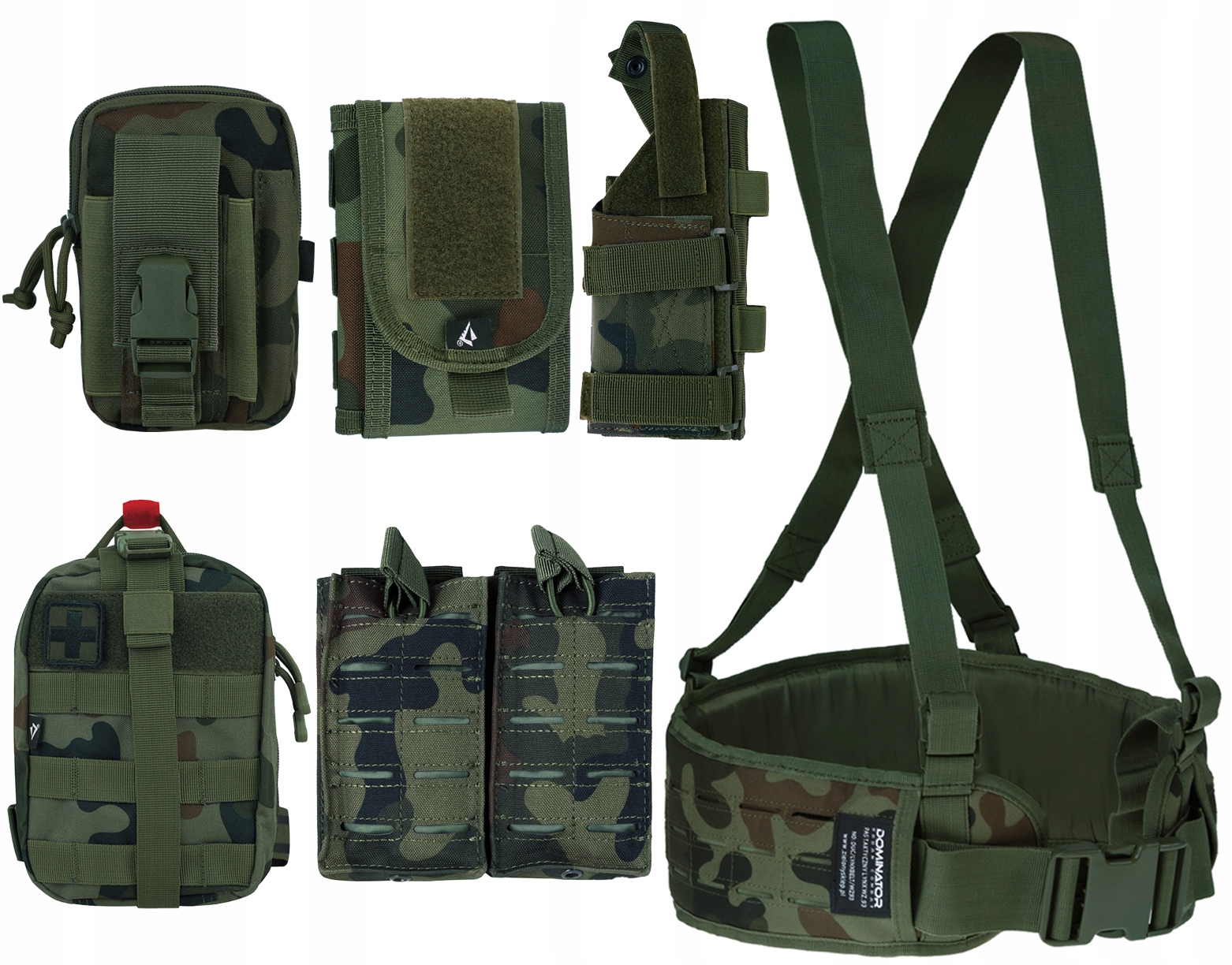 Ремені типу X польського бренду Dominator® з екіпіруванням (кобура Tornado, підсумок Magbag 2, підсумок Pers, підсумок Mesh bag та велика відривна аптечка.) Бренд DOMINATOR® забезпечує дуже високу якість, виготовлену на основі військових специфікацій, твердих матеріалів і передових технологій.