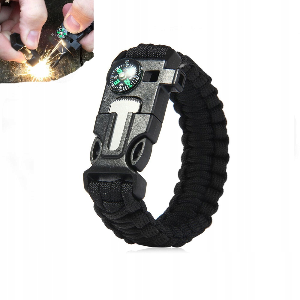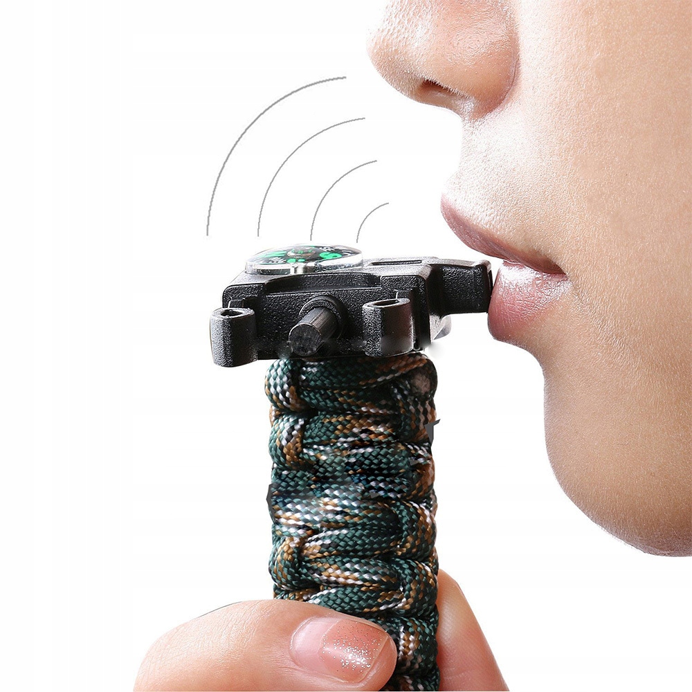 Він оснащений аварійним свистком, який можна використовувати для сповіщення учасників поблизу про наближення небезпеки або розташування вашого перебування. Серед необхідного спорядження для виживання також є трут, який дозволяє розпалити багаття, щоб зігрітися ввечері та відлякати диких тварин. Завдяки компасу вам буде легше визначити напрямок вашої подорожі, а маленьке лезо дозволить вам готувати їжу. Крім того, браслет маємотузку, яку можна використовувати для кріплення спорядження, шнурів для ножів і ліхтариків, для будівництва таборів і притулків або навіть як шнур для прання.