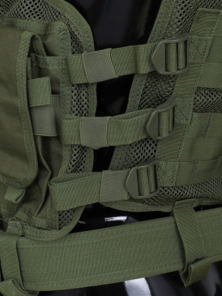 Тактичний жилет поділяється на дві частини і кріпиться блискавкою. Права сторона оснащена кишеню з організатором та панеллю на липучках для патчів та 3 мішками в стандарті Stanag. Сарай, розташований над плечем, оснащений ногою, що не має колби. Зліва є 4 універсальні сумки для журналів пістолетів, кобура для кожної моделі пістолета з журналом пістолета та однією сумкою в стандарті Stanag. Кобустер має можливість роз'єднати. Всі сумки кріпиться на липучках