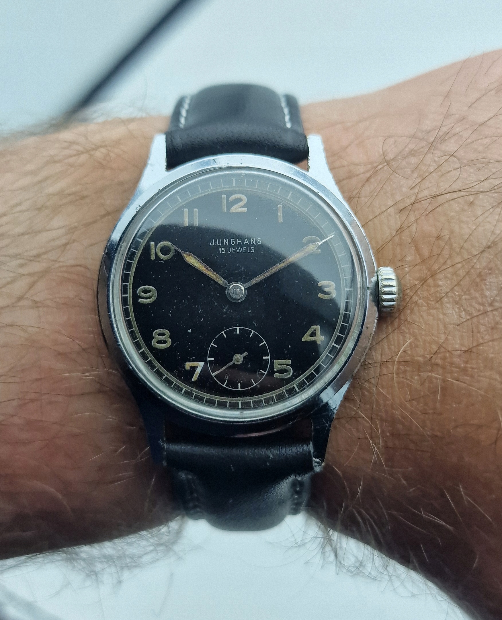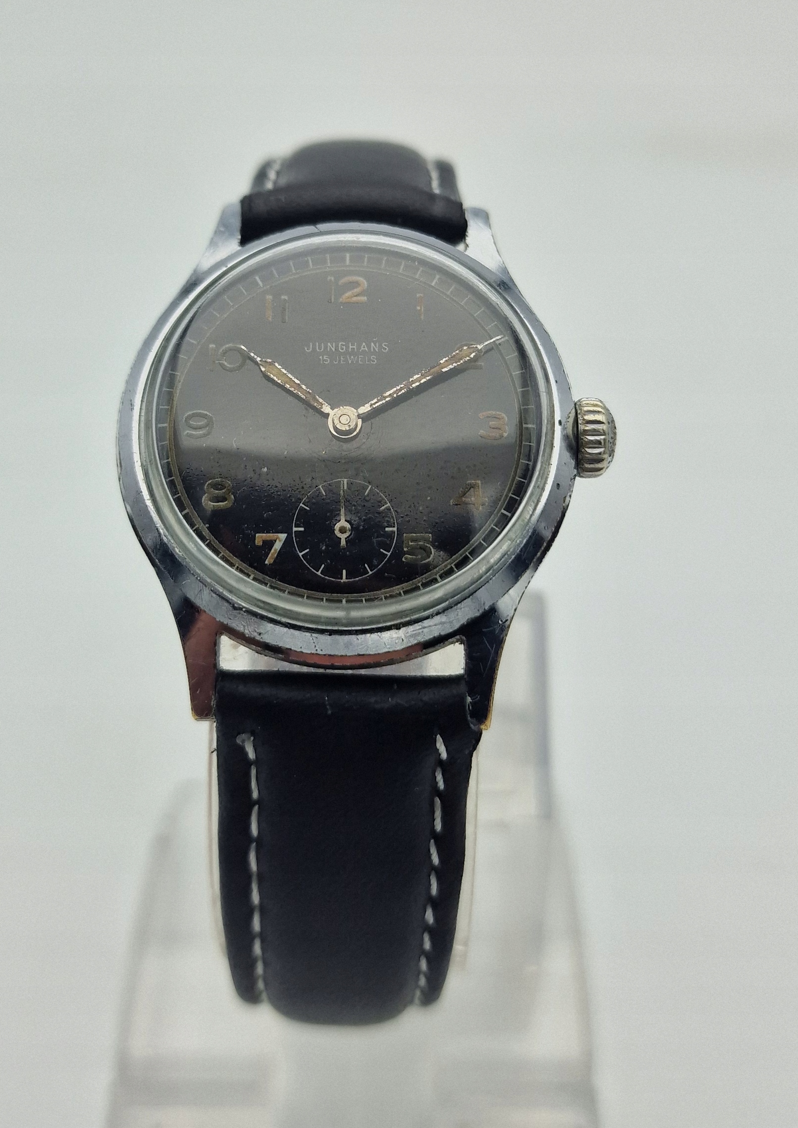- Чорний металевий щит з окремою секундою о шостій годині. Оригінальний щит, підписаний: " junghans, 15 коштовностей ". Щит у майже ідеальному стані, показаний на знімках.