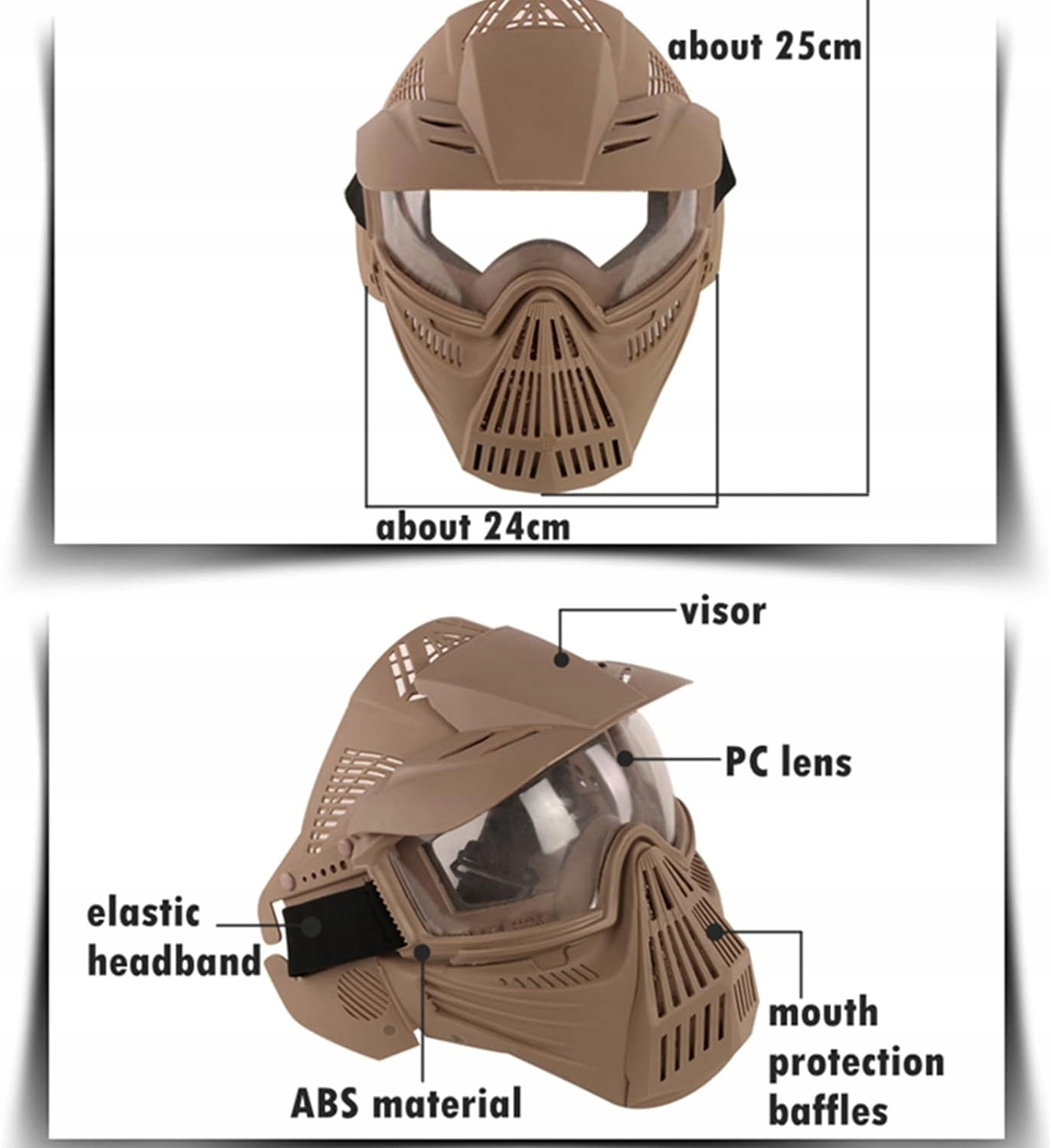 Матеріал Полікарбонатний матеріал і ударостійкий пластик ABS забезпечують повний захист обличчя та голови. Перевага Лінзи проти запотівання пройшли випробування на падіння ANSI Z80.3 і стійкість до ударів у радіусі 5 метрів становить 420 кадрів в секунду при температурі від 10°C до 42°C. Повітропроникні та зручні. Регульований еластичний ремінь для комфортної посадки. Навушники маски можуть бути злегка зігнутий, щоб краще відповідати обличчю. Стабільність. Затінення козирка може захистити вас від сонячного світла. Губкові килимки. Очі та вуха є надійним буфером для комфорту при носінні. Широке застосування ідеально підходить для пейнтболу, страйкболу, тактичних ігор. CS. /p>