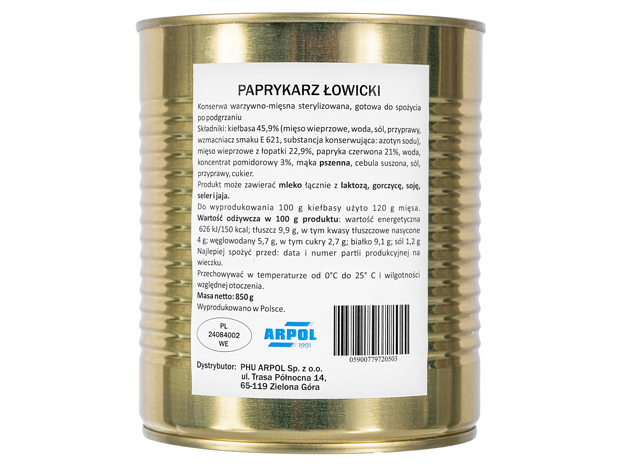Paprykarz łowicki Arpol 850 gце військова м'ясо-овочева страва для двох осіб, яка містить шматочки свинини та скибочки ковбаси у смачному соусі з червоного перцю та цибулі і помідори.
